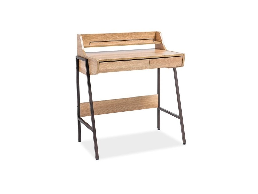 Jednoduchý pracovní stůl se dvěma zásuvkami. Konstrukce je kovová v tmavě hnědé barvě, deska je z kvalitní MDF v barvě dub. Součástí stolu je nástavec s poličkou. Vhodný i pro menší pokoje. Dodáváme v demontovaném stavu.Doplňkové parametry