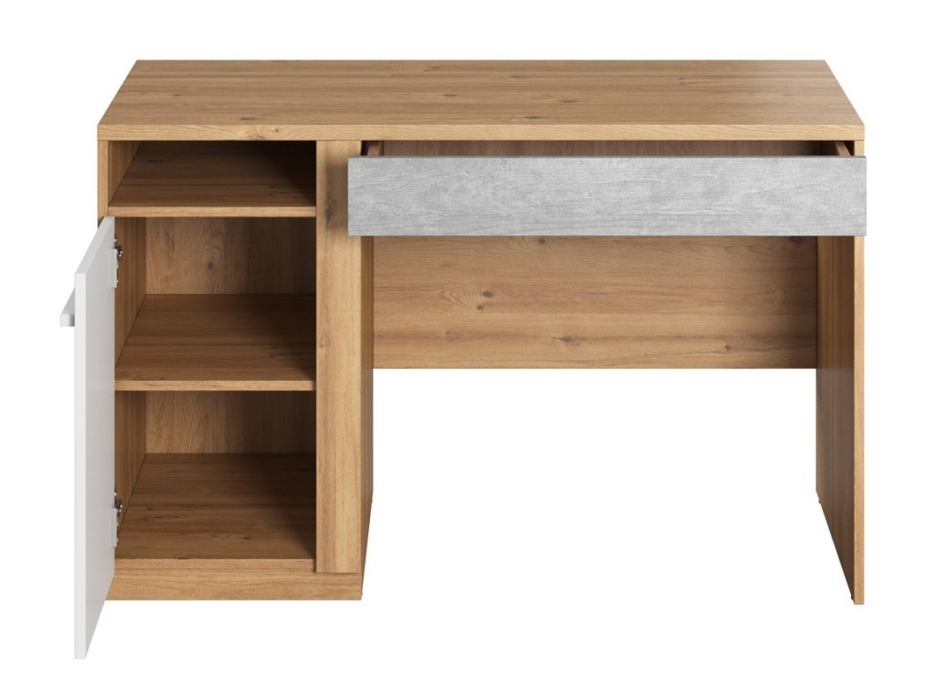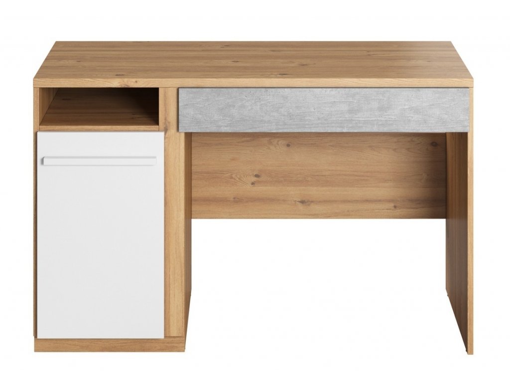 Pracovní stůl jednodveřový se zásuvkou v moderním stylu. Korpus je vyroben z desky LTD v barvě dub nash, dvířka a čelo zásuvky jsou vyrobeny z desky LTD v kombinaci barev šedá/bílá. Dodáváme v demontovaném stavu.Doplňkové parametry