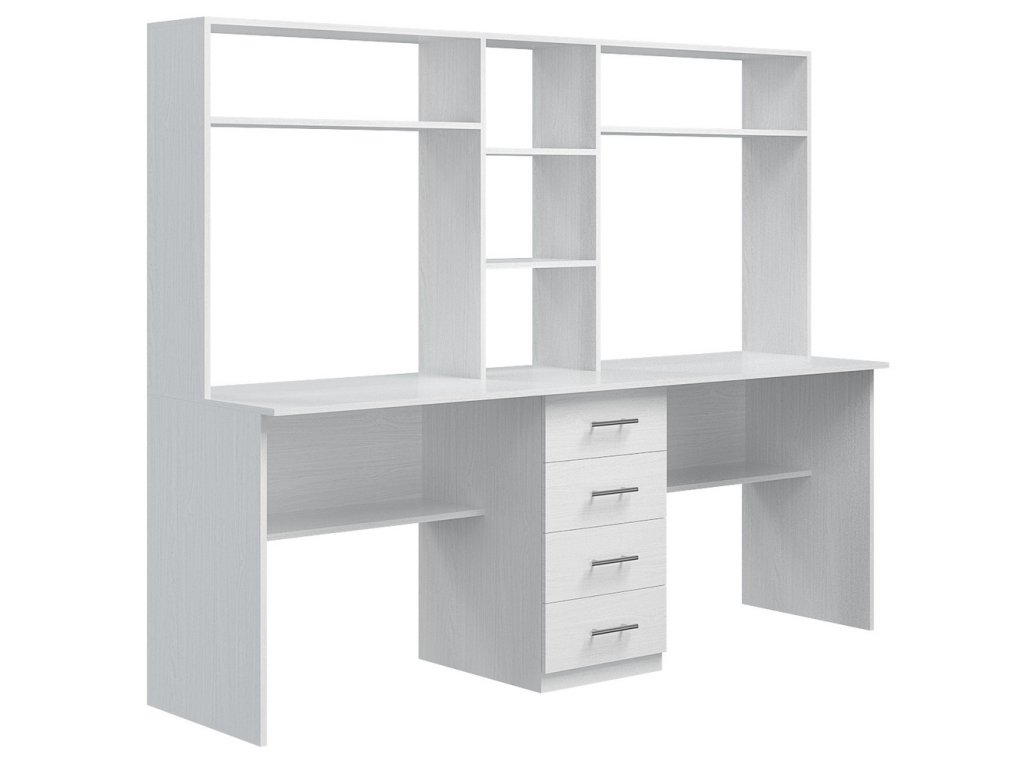 Praktický pracovní stůl se dvěma pracovními plochami a policovým nástavcem je vyroben z LTD desky odolné vůči poškrábání v barvě bílá strukturální. Stůl je uprostřed rozdělen čtyřmi zásuvkami. Výška stolu včetně nástavce je 152 cm, hloubka nástavce je 30 cm. Výška pracovní plochy je 76,5 cm. Dodáváme v demontovaném stavu.Doplňkové parametry
