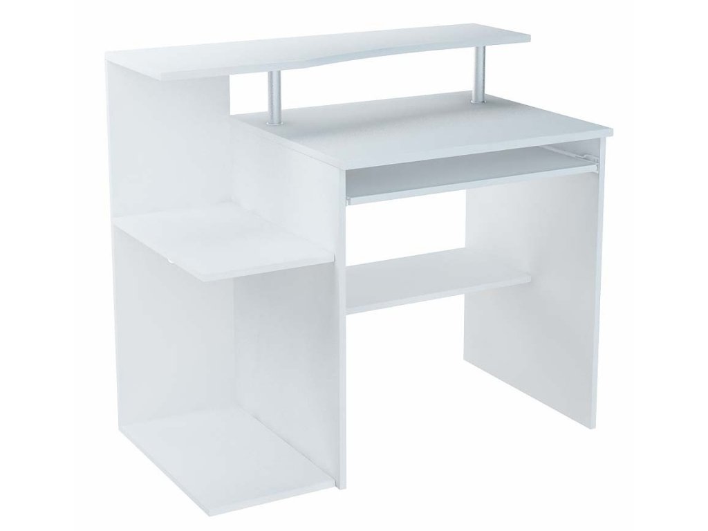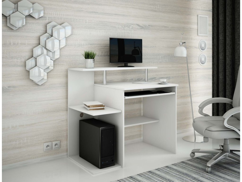 PC stolek s dostatkem polic, který je vyrobený z kvalitního lamina. Stolek obsahuje výsuvnou poličku pro klávesnici. Lamino je odolné proti poškrábání, poškození, vlhkosti a vysokým teplotám. Stolek je v barevném provedení matná bílá. Dodáváme v demontovaném stavu.Doplňkové parametry