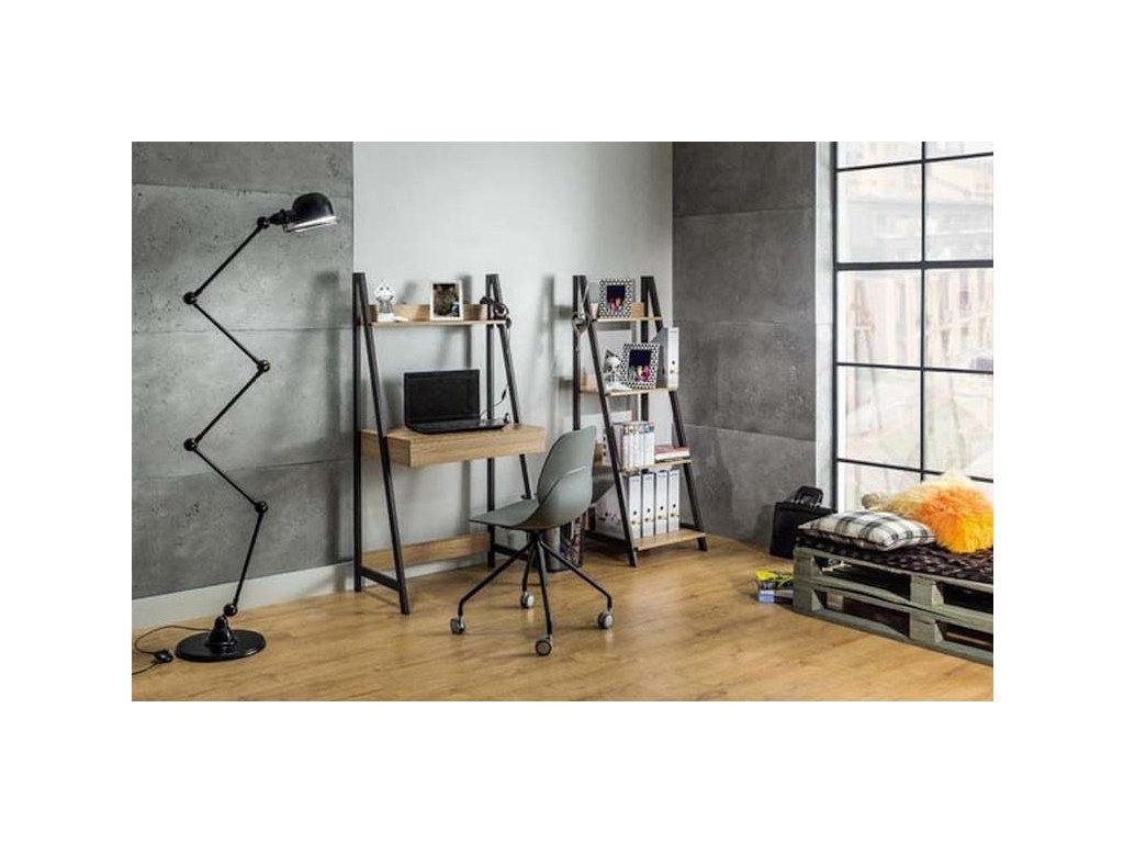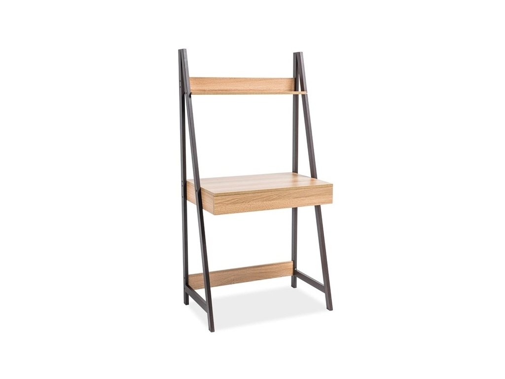 Jednoduchý, ale praktický pracovní stůl se zásuvkou. Zajímavá konstrukce nožek stolu má nahoře poličku. Konstrukce je kovová tmavě hnědé barvy, deska z kvalitního MDF v barvě dub. Vhodný i pro menší pokoje. Možno kombinovat s Matis A.Doplňkové parametry