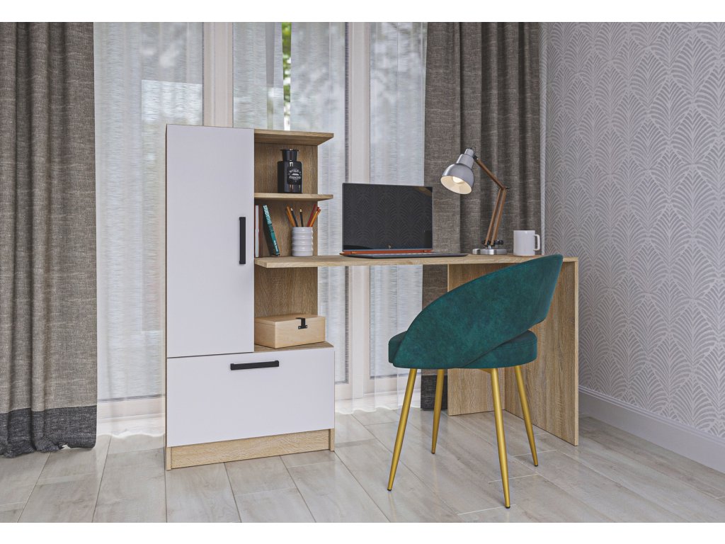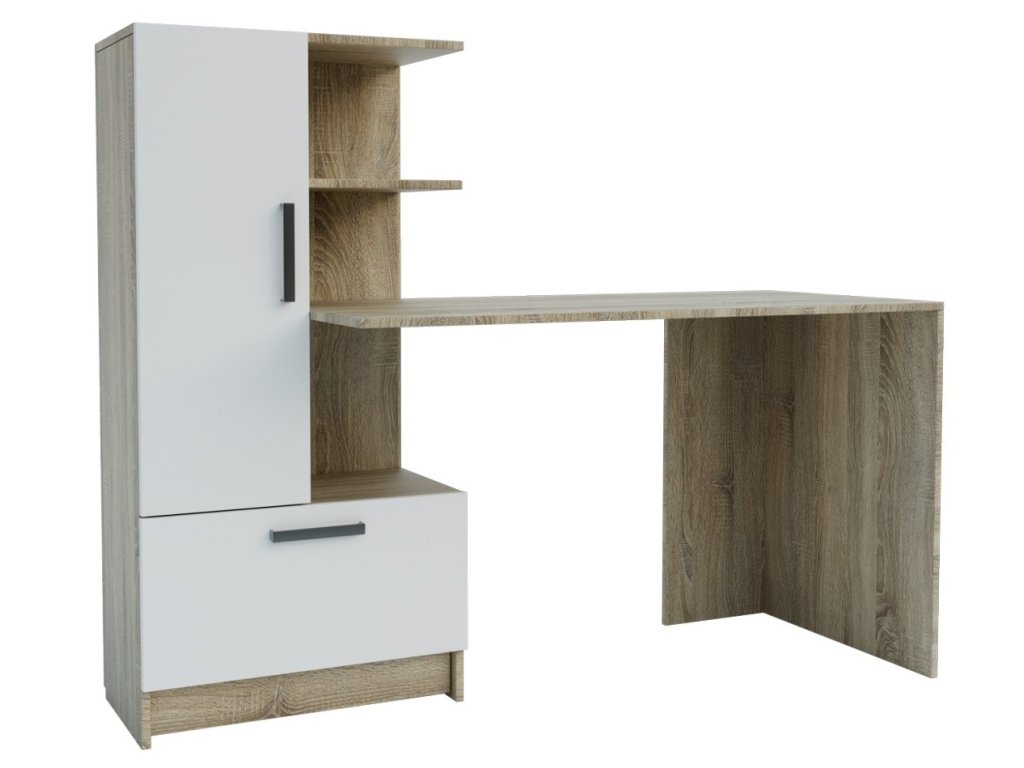 Praktický pracovní stůl levý. Pracovní stůl proveden v jednoduché linii, který se hodí do moderního interiéru. Je vyroben z LTD desky odolné vůči poškrábání v barvě dub sonoma v kombinaci s matnou bílou (nymphaea alba). Spodní skříňka je výklopná. Rozměry viz perokresba .Dodáváme v demontovaném stavu.Doplňkové parametry