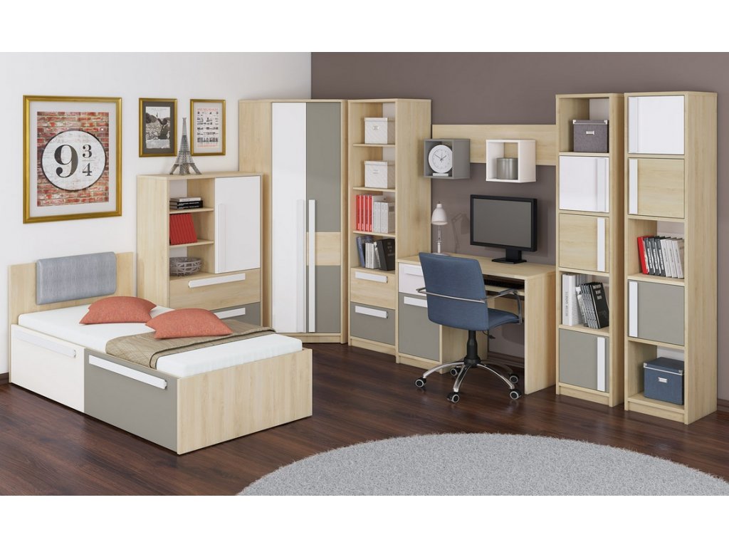 Sestava do dětského pokoje v moderním provedení. Korpus je vyroben z kvalitní desky LTD hraněné ABS páskou v barvě buk fjord, dvířka jsou vyrobeny z desky LTD v kombinaci barev...