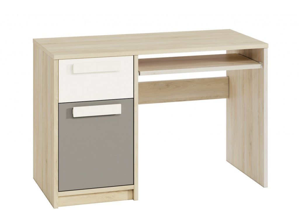 Pracovní stůl s dvířky a zásuvkou v moderním provedení. Korpus je vyroben z kvalitní desky LTD hraněné ABS páskou v barvě buk fjord, zásuvka a dvířka jsou vyrobeny z desky LTD v kombinaci barev bílá/šedá. Úchyty jsou dřevěné bílé. Dodáváme v demontovaném stavu.Doplňkové parametry