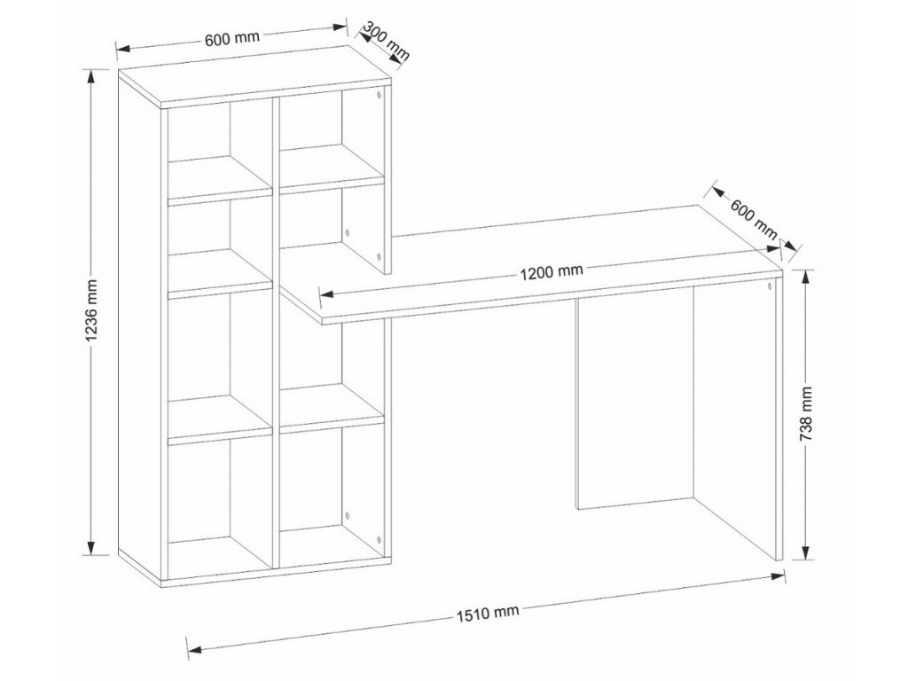 Pracovní stůl s regálem je vyroben z kvalitního lamina o tl.18 mm hraněné PVC páskou, odolného proti poškrábání v kombinaci barev matná bílá/vlašský ořech. Velikost regálu je (Š x V x H cm) 60 x 123,6 x 30 cm. Dodáváme v demontovaném stavu.Doplňkové parametry