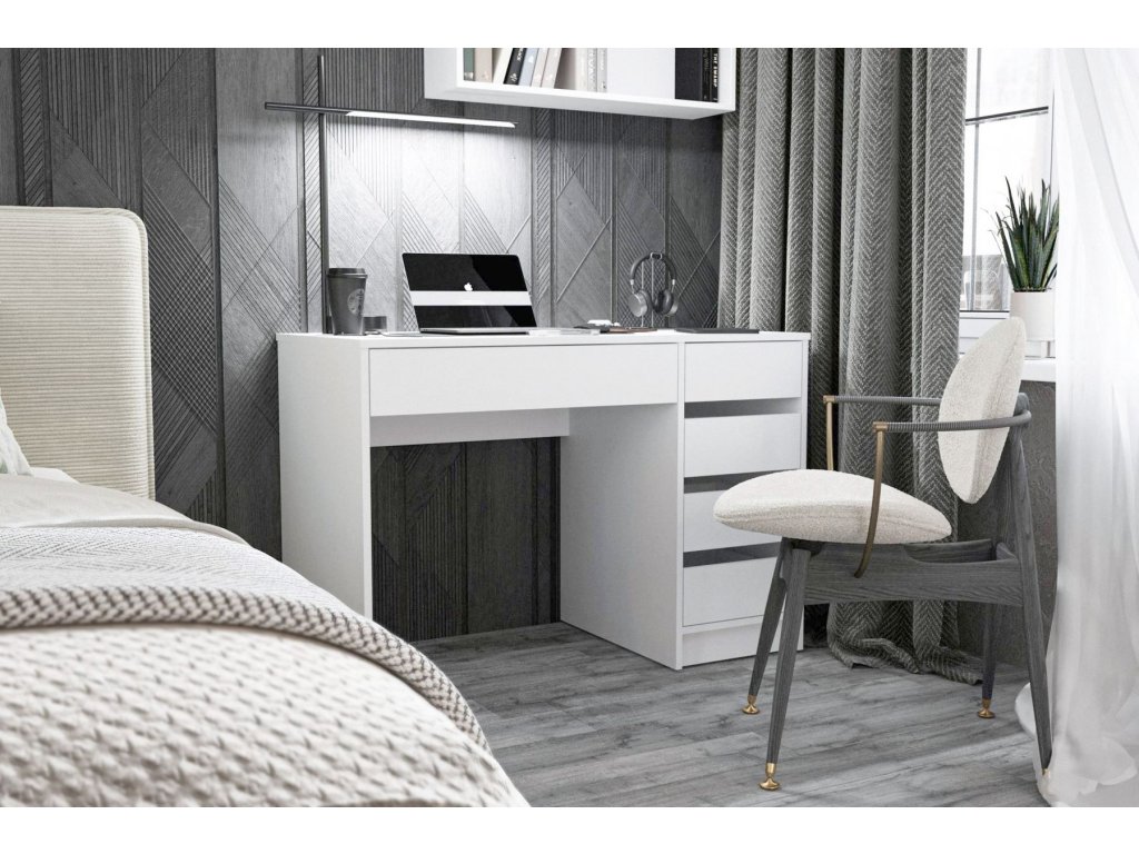 Elegantní pracovní stůl. Je mimořádně praktický díky pěti zásuvkám na teleskopických kolejnicích. je vyrobený z kvalitní laminátové desky v barevném provedení matná bílá (nymphea alba). Jde o pravou variantu, lze zakoupit i opačnou verzi. Dodáváme v demontovaném stavu.Doplňkové parametry