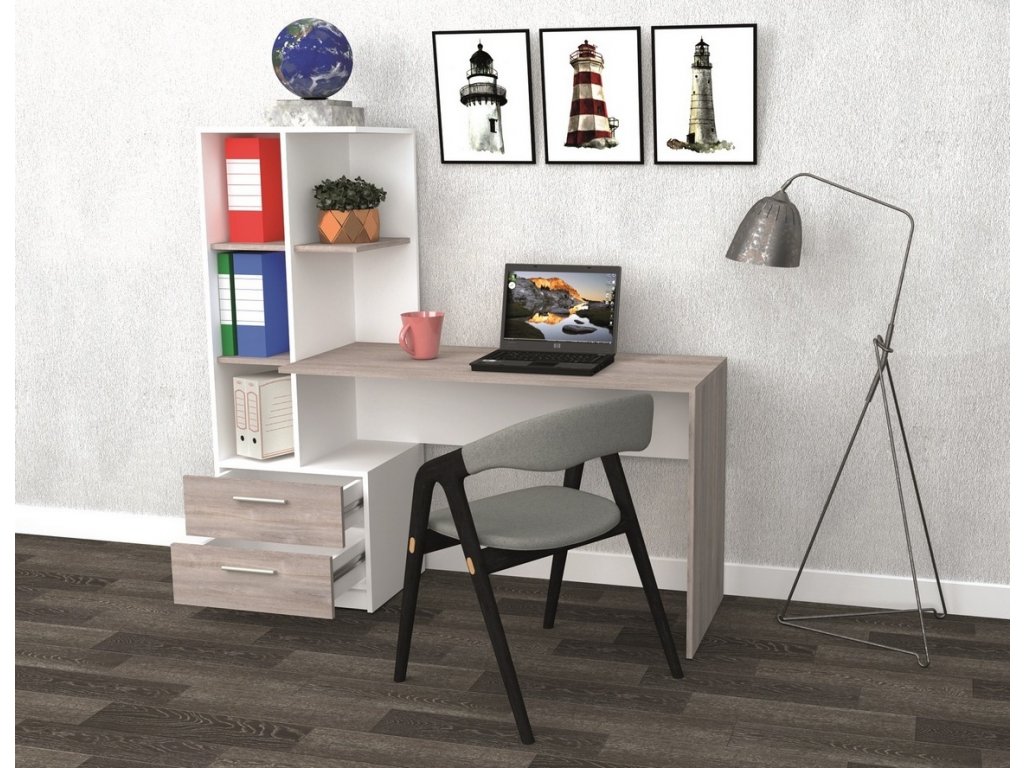 Pracovní stůl se zásuvkami a regálem umístěným nalevo je proveden v jednoduché praktické linii, který se hodí do moderního interiéru. Korpus je vyroben z LTD desky odolné vůči poškrábání v kombinaci barev bílá/šedý dub (clubhouse). Výška desky pracovní plochy je 75 cm. Úchyty jsou plastové. Dodáváme v demontovaném stavu.Doplňkové parametry
