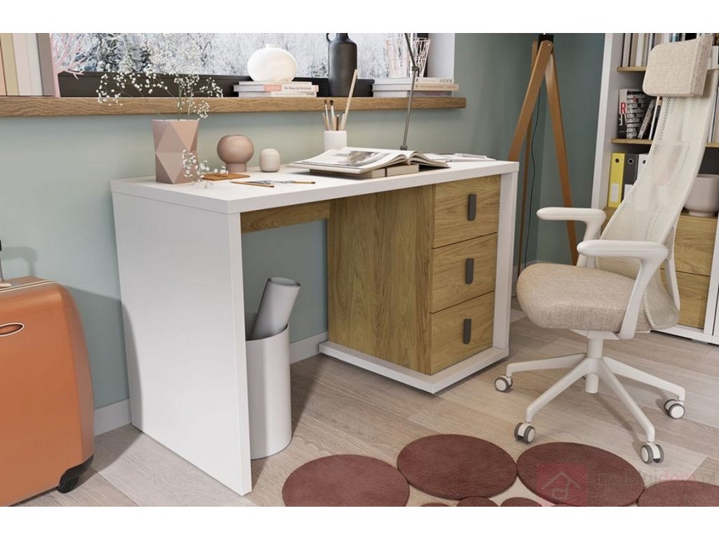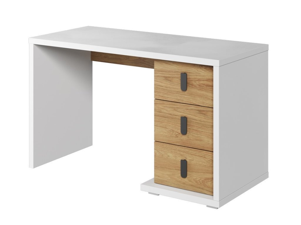 Pracovní stůl se třemi zásuvkami v jemném přírodním stylu. Korpus je vyroben z desky LTD v barvě bílá, zásuvky jsou vyrobeny z desky LTD v barvě ořech natural. Dodáváme v demontovaném stavu.Doplňkové parametry