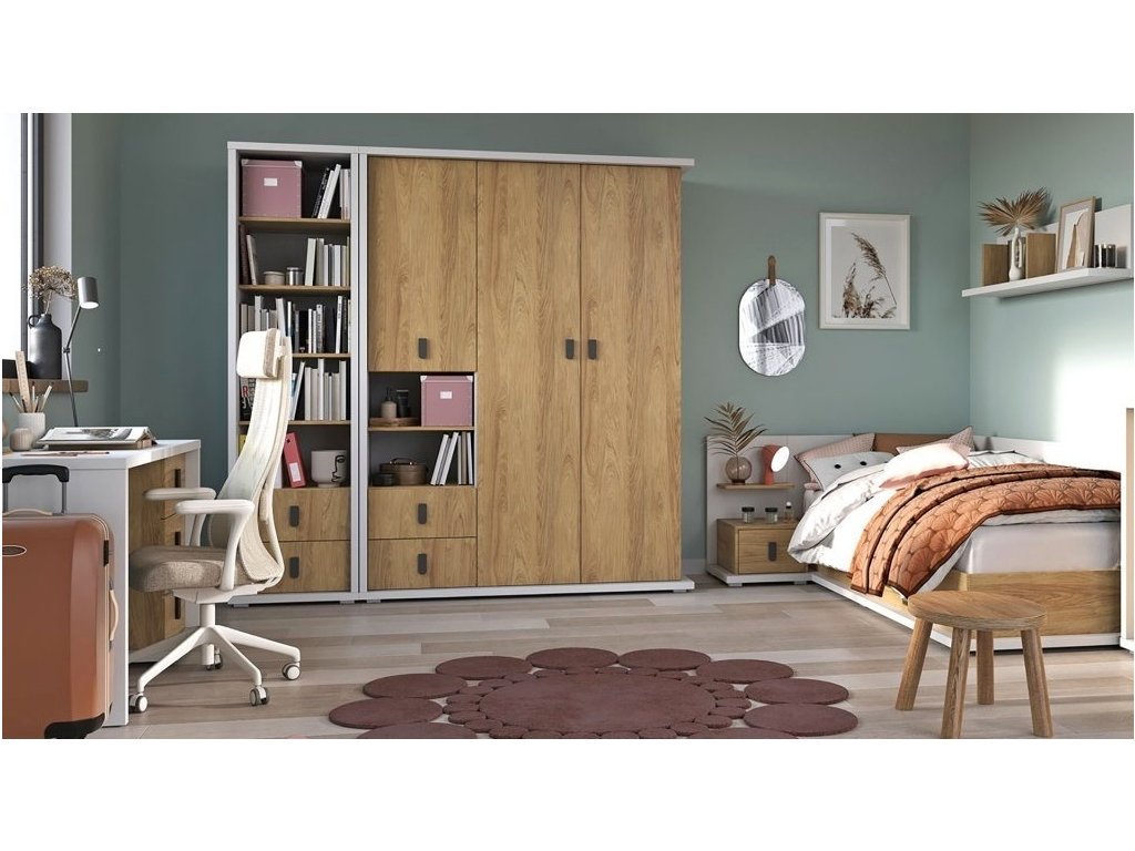 Sestava dětského pokoje v jemném přírodním stylu. Korpus je vyroben z desky LTD v barvě bílá, dvířka, zásuvky a police jsou vyrobeny z desky LTD v barvě ořech natural. Sestava...
