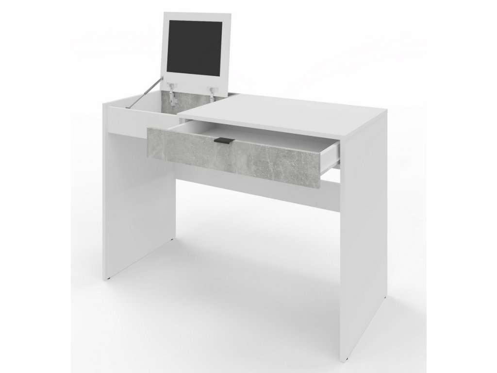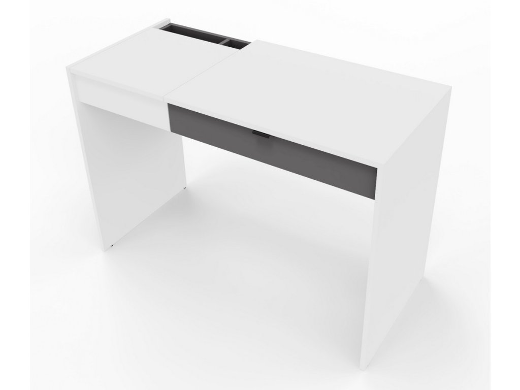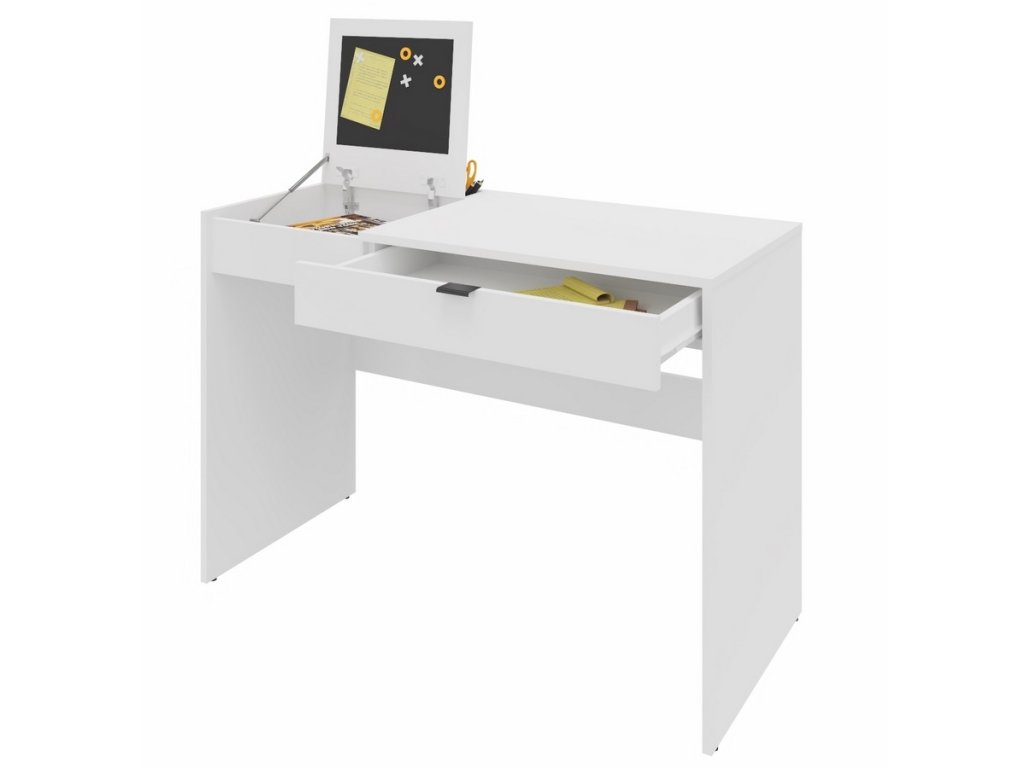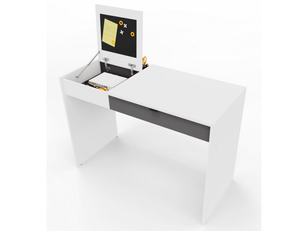 Skvělý pracovní stůl pro školáky! Stůl má klasický šuplík a druhý úložný prostor, kde po otevření získáte navíc i malou magnetickou tabuli. Dalším bonusem jsou pak zabudované 2 přihrádky pro drobnosti v rohu stolu. Ideální do malých dětských pokojů či pracoven. Barevné provedení - barva bílá mat s doplňky v barvě grafit. Dodáváme v demontovaném stavu. DOPRODEJ!Doplňkové parametry