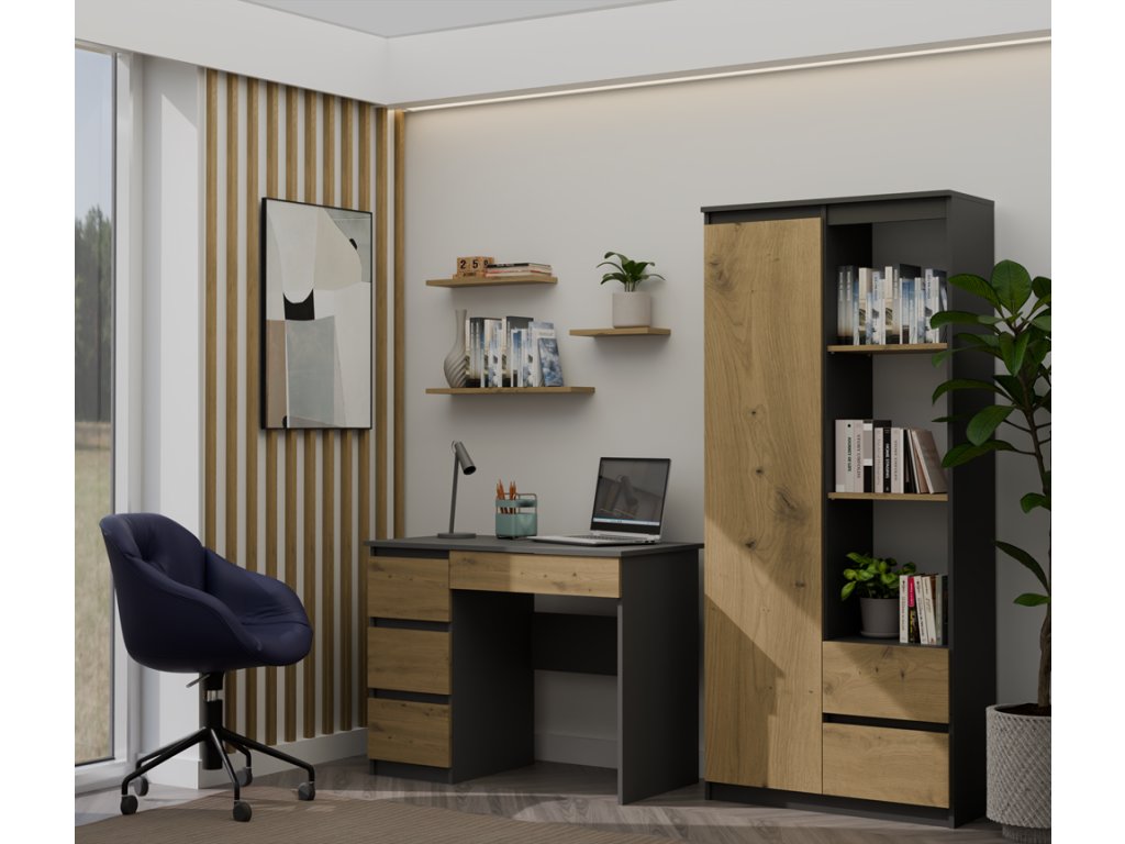 šířka: 115 cm | výška: 117 cm | hloubka: 64 cm Pracovní stůl s integrovanou policí je vyroben z desky LTD v barevném provedení černá/dub sonoma. Přední nohy stolu jsou kovové....