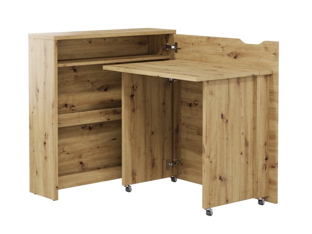 Rozkládací psací stůl v moderním a jednoduchém designu snadno složíte do komody a ušetříte tím spousty místa. Díky praktickým policím máte vše po ruce. Stůl je k dispozici ve dvou variantách - pravé nebo levé. Vyberte si ten, který lépe vyhovuje Vašim požadavkům. Kolečka umístěná pod bočními podpěrami usnadňují otevírání a zavírání stolu. Stůl je vyroben z lamina tloušťky 16 mm, pracovní deska stolu z lamina tloušťky 22 mm. Maximální nosnost police je 5 kg, pracovní desky 3 kg. Šířka stolu po rozložení je 136 cm. Dodáváme v demontovaném stavu.Doplňkové parametry