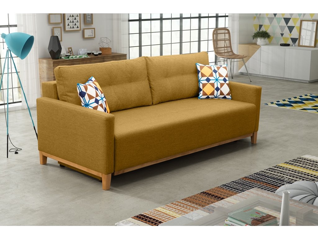 Pohovka Aristo ve skandinávském designu zaujme především svým jednoduchým a funkčním zpracováním. Pohovka je rozkládací a samozřejmostí je i úložný prostor, který poslouží např. na lůžkoviny. Jednoduchým rozložením pomocí automatu, získáte lůžko k příležitostnému přespání Vaší návštěvy. Návod na rozložení můžete shlédnout v krátkém gifu v doplňkových fotografiích. Naleznete tam také detailní rozměry pohovky. Pohodlí při sezení zajišťuje výplň sedáku, která je složena z pružin bonell a kvalitní PUR pěny a také opěrné polštáře, které jsou odnímatelné a můžete si je přizpůsobit podle svých potřeb. Pohovku nabízíme v několika barevných provedeních. Úvodní fotografie je ilustrační, vzorek látky, ve které bude pohovka dodána, je vyobrazen v doplňkových fotografiích. Moření dřeva není možno zvolit. V ceně pohovky jsou 2 malé vzorované polštářky, které jsou vyobrazené na fotografii. Ostatní vyobrazené doplňky a dekorace nejsou v ceně.