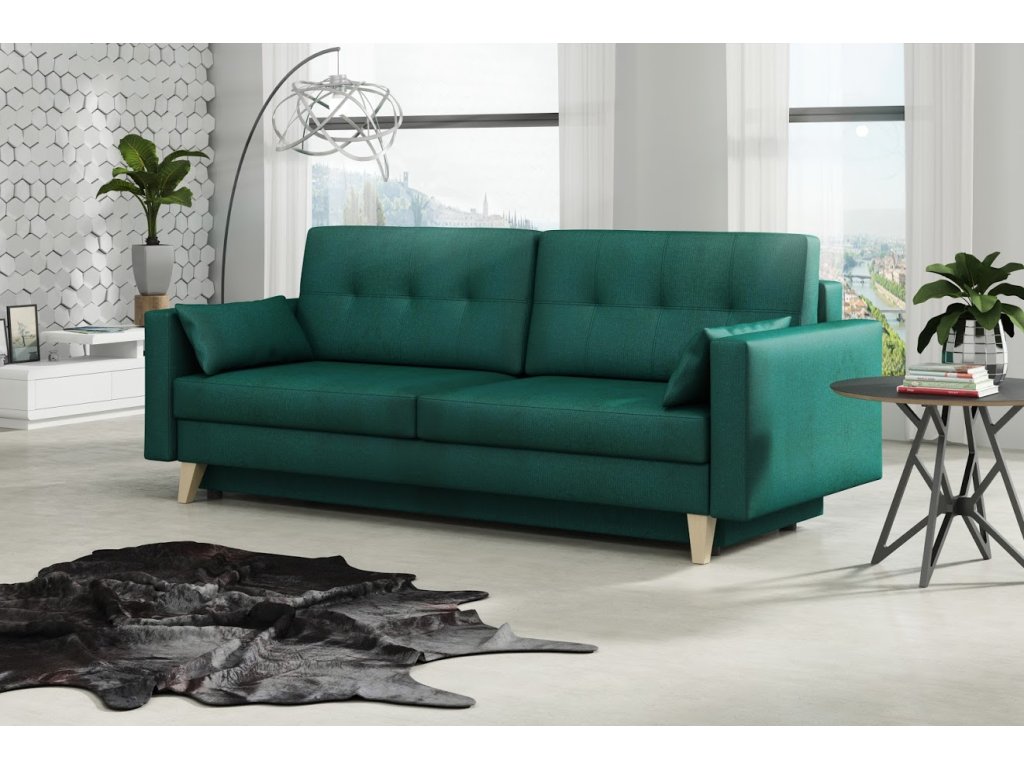 Pohovka Marina je krásným elegantním kouskem s nádechem RETRO designu a výborně zapadne do každého interiéru. Retro design podtrhují zešikmené dřevěné nohy a látkové knoflíky na opěrce. Pohovka je rozkládací a samozřejmostí je i nepostradatelný úložný prostor. Jednoduchým rozložením pomocí automatu vznikne dostatečně prostorné lůžko občasnému přespání Vaší návštěvy. Výpň sedáku tvoří vlnité pružiny v kombinaci s pružinami bonell a kvalitní PUR pěnou. Pohovka je celočalouněná, takže ji můžete umístit i do prostoru. Výborně se hodí do obývacího pokoje, do pracovny či pokoje pro hosty. Pohovku nabízíme v několika trendy barvách. Vyobrazené dopňky a dekorace nejsou v ceně.