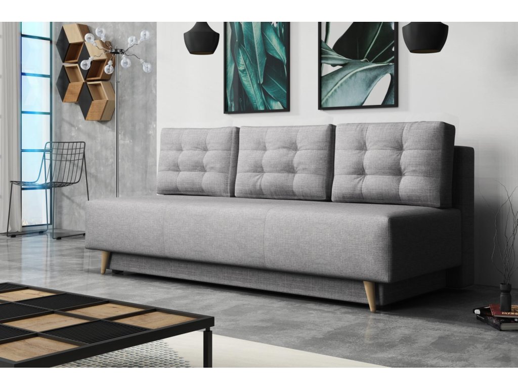 Pohovka Sebastian je elegantním kouskem sedacího nábytku s nádechem RETRO designu a výborně zapadne do každého interiéru. Retro design podtrhují zešikmené dřevěné nohy a látkové knoflíky na opěrných polštářích. Pohovka je rozkládací a samozřejmostí je i nepostradatelný úložný prostor. Jednoduchým rozložením pomocí automatu vznikne dostatečně prostorné lůžko občasnému přespání Vaší návštěvy. Výpň sedáku tvoří pružiny bonell a kvalitní PUR pěna. Pohovka je celočalouněná, takže ji můžete umístit i do prostoru. Výborně se hodí do obývacího pokoje, do pracovny či pokoje pro hosty. Pohovku nabízíme v několika trendy barvách. Vyobrazené dopňky a dekorace nejsou v ceně.