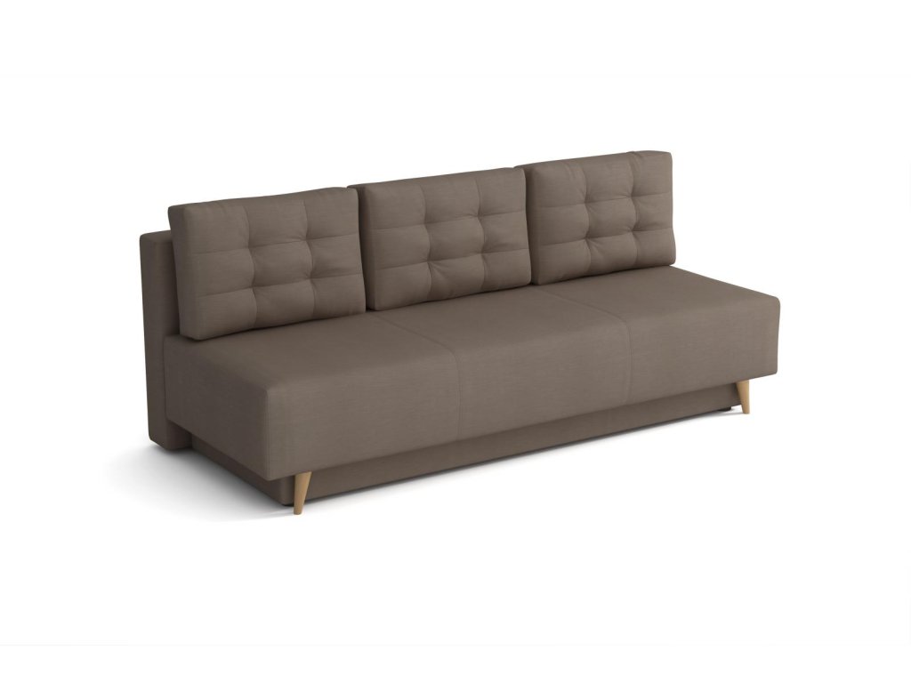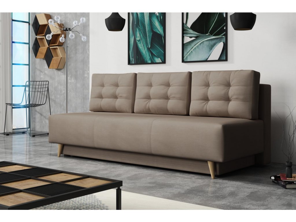 Pohovka Sebastian je elegantním kouskem sedacího nábytku s nádechem RETRO designu a výborně zapadne do každého interiéru. Retro design podtrhují zešikmené dřevěné nohy a látkové knoflíky na opěrných polštářích. Pohovka je rozkládací a samozřejmostí je i nepostradatelný úložný prostor. Jednoduchým rozložením pomocí automatu vznikne dostatečně prostorné lůžko občasnému přespání Vaší návštěvy. Výplň sedáku tvoří pružiny bonell a kvalitní PUR pěna. Pohovka je celočalouněná, takže ji můžete umístit i do prostoru. Výborně se hodí do obývacího pokoje, do pracovny či pokoje pro hosty. Pohovku nabízíme v několika trendy barvách. Vyobrazené doplňky a dekorace nejsou v ceně.