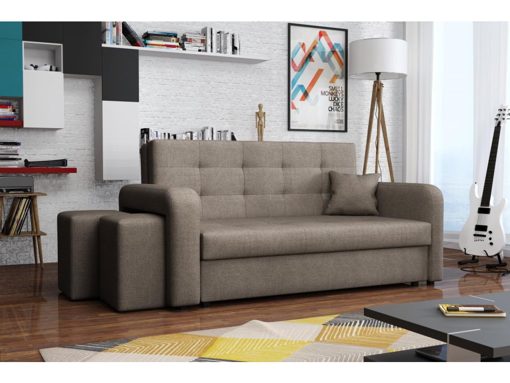 Rozkládací pohovka Vivian je díky svým rozměrům vhodná i do menších pokojů. Své uplatnění najde nejen v obývacím pokoji, ale také v dětském, studentském, nebo hostinském pokoji. Jednoduchým rozložením pomocí automatu, získáte lůžko k příležitostnému přespání Vaší návštěvy. Výplň sedáku tvoří vlnité pružiny v kombinaci s PUR pěnou. Pohovka je potažena kvalitní látkou a nabízíme ji v několika trendy odstínech. Pohovka disponuje i nepostradatelným úložným prostorem, který využijete např. na deku a polštář. V ceně pohovky je 1 dekorační polštář a 2 taburety, které jsou důmyslně uložené v područi pohovky. Taburety můžety využít k sezení, nebo k podepření nohou při odpočinku. Ostatní vyobrazené dekorace nejsou v ceně. Vyobrazené dopňky a dekorace nejsou v ceně.