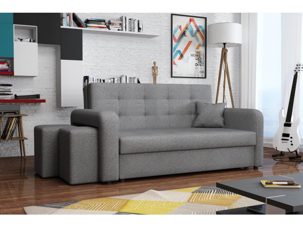 Rozkládací pohovka Vivian je díky svým rozměrům vhodná i do menších pokojů. Své uplatnění najde nejen v obývacím pokoji, ale také v dětském, studentském, nebo hostinském pokoji. Jednoduchým rozložením pomocí automatu, získáte lůžko k příležitostnému přespání Vaší návštěvy. Výplň sedáku tvoří vlnité pružiny v kombinaci s PUR pěnou. Pohovka je potažena kvalitní látkou a nabízíme ji v několika trendy odstínech. Pohovka disponuje i nepostradatelným úložným prostorem, který využijete např. na deku a polštář. V ceně pohovky je 1 dekorační polštář a 2 taburety, které jsou důmyslně uložené v područi pohovky. Taburety můžety využít k sezení, nebo k podepření nohou při odpočinku. Ostatní vyobrazené dekorace nejsou v ceně. Vyobrazené dopňky a dekorace nejsou v ceně.