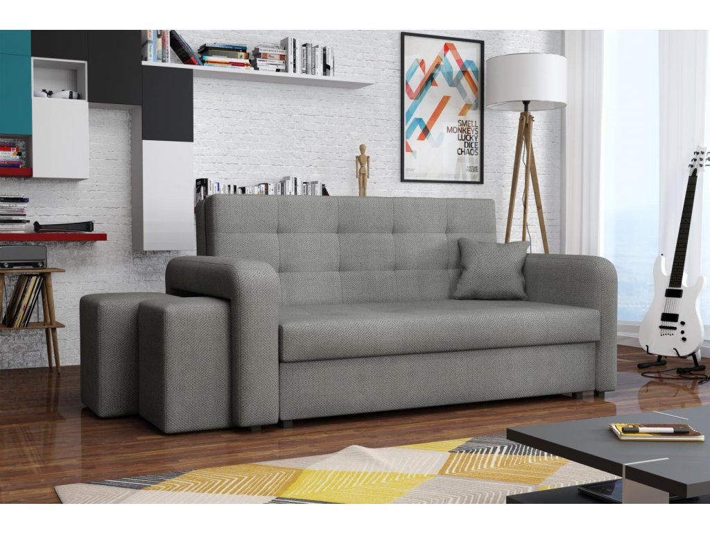 Rozkládací pohovka Vivian je díky svým rozměrům vhodná i do menších pokojů. Své uplatnění najde nejen v obývacím pokoji, ale také v dětském, studentském, nebo hostinském pokoji. Jednoduchým rozložením pomocí automatu, získáte lůžko k příležitostnému přespání Vaší návštěvy. Výplň sedáku tvoří vlnité pružiny v kombinaci s PUR pěnou. Pohovka je potažena kvalitní látkou a nabízíme ji v několika trendy odstínech. Pohovka disponuje i nepostradatelným úložným prostorem, který využijete např. na deku a polštář. V ceně pohovky je 1 dekorační polštář a 2 taburety, které jsou důmyslně uložené v područi pohovky. Taburety můžety využít k sezení, nebo k podepření nohou při odpočinku. Ostatní vyobrazené dekorace nejsou v ceně. Vyobrazené dopňky a dekorace nejsou v ceně.