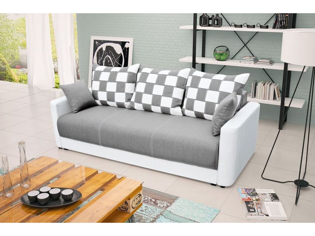 Moderní rozkládací pohovka s úložným prostorem. Výplň pohovky tvoří pružiny bonell a faliste v kombinaci s kvalitní PUR pěnou. Jednoduchým rozkladem pomocí automatu vznikne lůžko vhodné k příležitostnému spaní. Pohovku dodáváme v několika barevných provedeních, které také naleznete v naší nabídce. Rozpis rozměrů najdete na přiloženém obrázku s nákresem. V ceně pohovky jsou 3 velké kostkované polštáře a 2 malé polštáře v barvě pohovky. Ostatní vyobrazené dekorace nejsou v ceně.