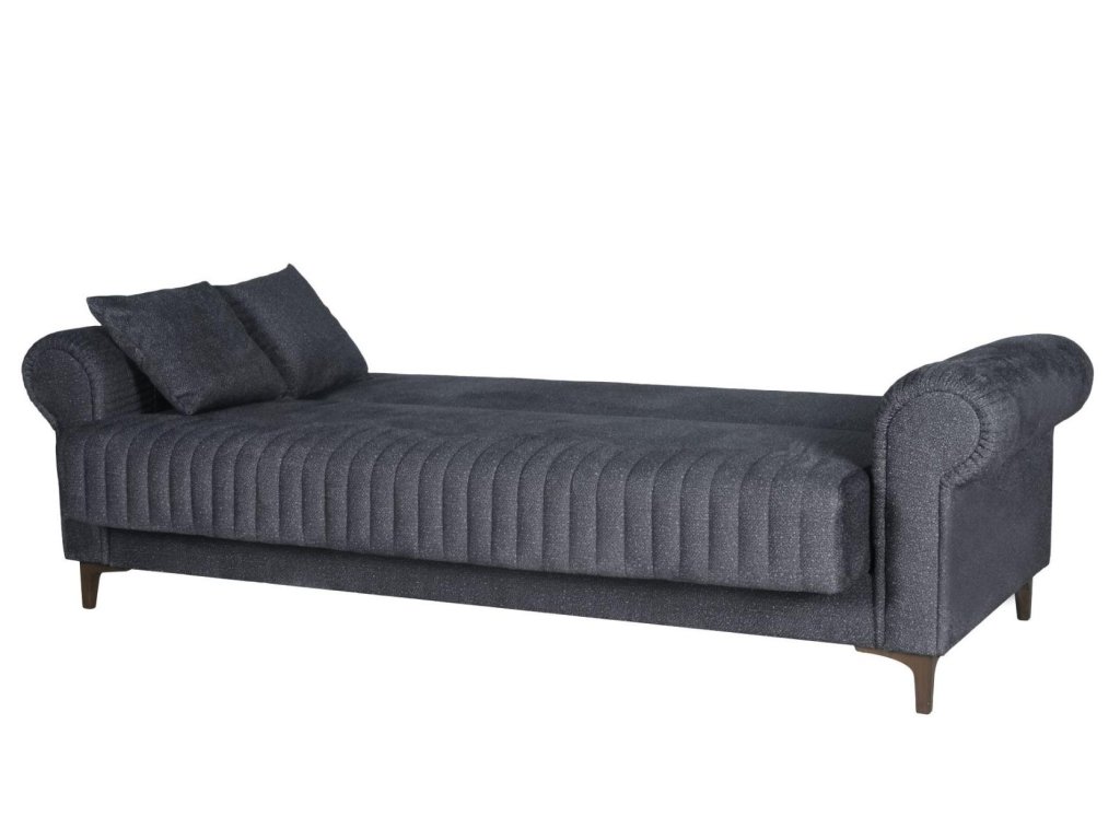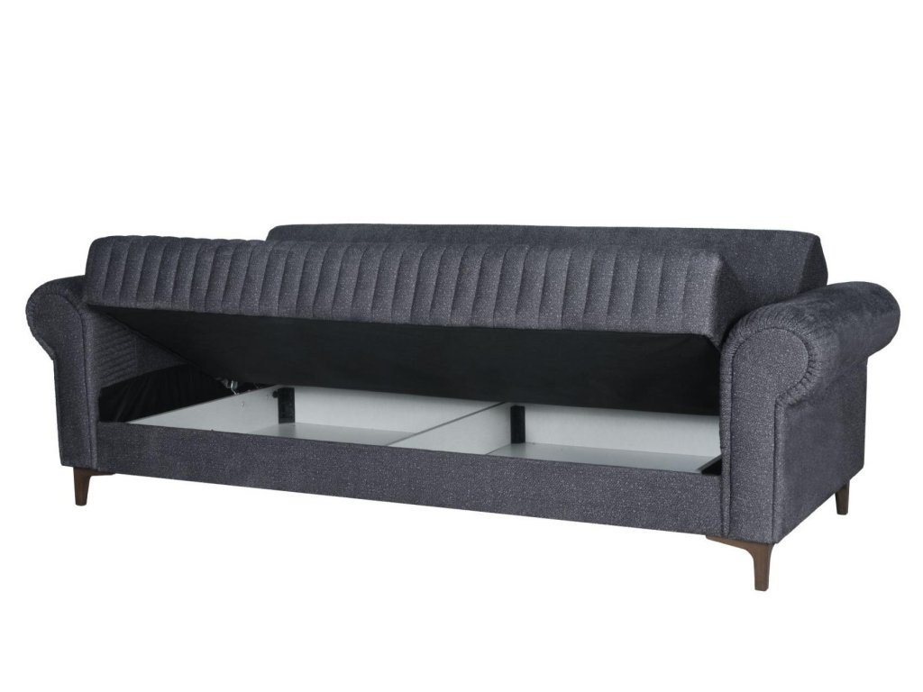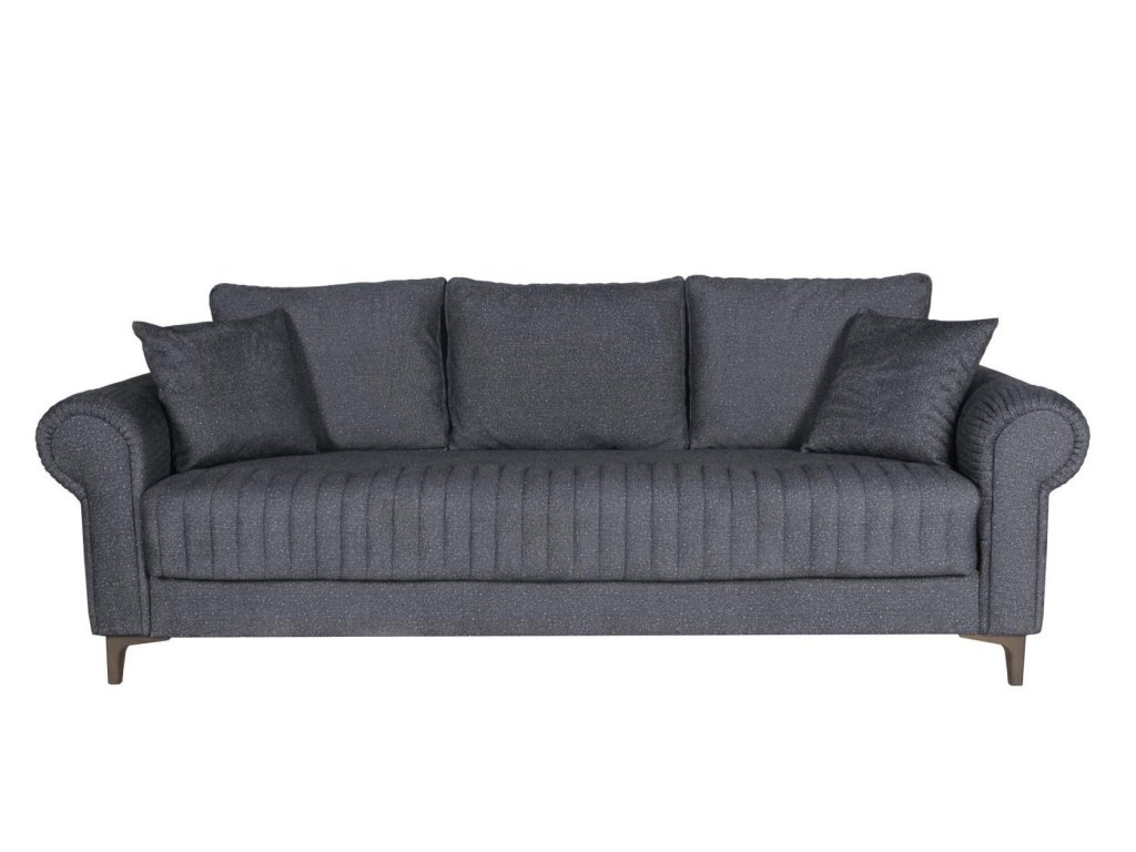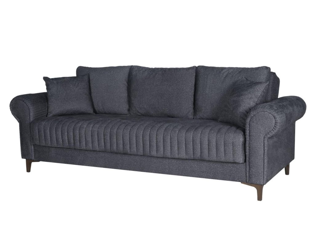 Třímístná pohovka s funkcí spaní a úložným prostorem bude praktickým kouskem do každého interiéru. Pohovka je ideální pro každodenní odpočinek, ale také vhodné místo ke spaní nejen pro Vás, ale i vaše hosty. Za komfort sezení a spaní jsou zodpovědné pružiny Bonnell a vysoce kvalitní PUR pěna. Úložný prostor pod sedákem poskytuje dostatek prostoru pro uskladnění ložního prádla či přikrývek. Pohovka je čalouněna kvalitní potahovou látkou v tmavě šedé barvě a stojí na plastových nožičkách. Zajímavé prošívání na sedací části a tvarované područky dávají pohovce jemně rustikální charakter. Specifikace: spací plocha po rozložení: 120 x 182 cm, celkové rozměry: Š:232/H:98/V:84 cm. K pohovce lze dokoupit i samostatné křeslo.