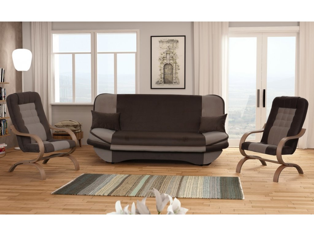 Praktická rozkládací pohovka se 2 křesly. Elegantní a velmi moderní vzhled. Sedačka obsahuje úložný prostor a prostor na příležitostní spaní. Po rozložení je spací plocha 200 x 122 cm. Rozklad je snadný, jedná se o klasický klik-klak systém, přední část se nadzvedne, zadní potom sklopí. Úložný prostor se nachází pod sedákem. Polštářky nejsou v ceně, možnost objednání za příplatek. Pohodlné sezení zaručují bonelové pružiny spolu s PUR pěnou. Výška sedu je 45 cm a hloubka sedu je 56 cm. Nožky jsou z plastu. Rozměry pohovky - 200 x 95 x 100 cm. Rozměry křesla - 65 x 75 x 100 cm. Výška i hloubka sedu je 43 cm. Nosnost křesla je 120 kg. Dřevěná konstrukce je v barvě buk. Barevné provedení setu - látka tmavě hnědá Inari 28 a Inari 22 světle hnědá.Doplňkové parametry