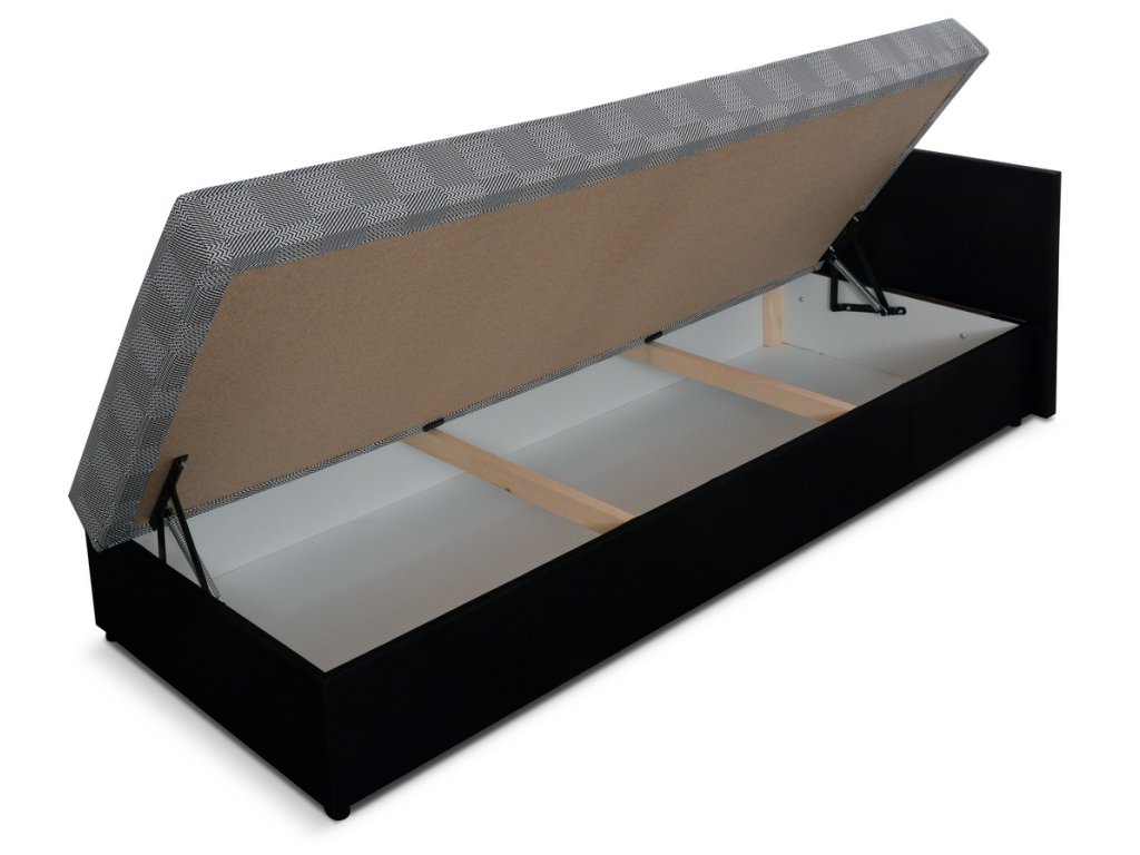 Pohodlná válenda v klasickém stylu. Pohovka obsahuje praktický úložný prostor. Spací plocha je 200 x 80 cm. Pohodlné sezení zaručují bonelové pružiny spolu s PUR pěnou. Nosnost pohovky je 90 kg. Můžete si vybrat, zda si přejete čelo postele na levé nebo pravé straně. Barevné provedení - látka London 13100 s potiskem ( červená ) a látka Sawana 14 ( černá ). Polštář je součástí válendy.