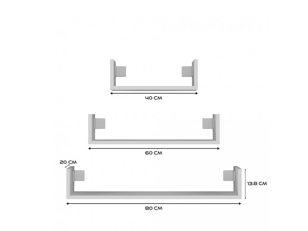 Sada 3 ks nástěnných poliček různých velikostí v jednoduchém designu. Závěsné police vypadají skvěle, když pod nimi stojí komoda nebo TV stolek, vytvářejí tak souvislý celek. Vyrobeno z kvalitní LTD desky, která má tloušťku 16 mm a je nenáročná na údržbu. Balení obsahuje poličku, šrouby a hmoždinky pro uchycení. Nosnost poličky je 5kg.Dodáváme v demontu.Doplňkové parametry