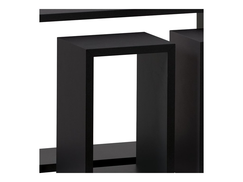 Sada tří nástěnných polic v černém matném provedení je vyrobena z MDF materiálu, který zajišťuje pevnost a stabilitu. Jednoduchý a čistý design polic umožňuje jejich univerzální využití v různých typech interiérů, ať už jako praktický úložný prostor nebo dekorativní prvek. Police mají otevřený tvar obdélníkových rámů, což usnadňuje přístup k uloženým předmětům a zároveň vytváří vzdušný dojem. Díky různým rozměrům jednotlivých kusů lze sestavit zajímavé kompozice na stěně. Balení obsahuje ochrannou fólii pro bezpečnou manipulaci a přepravu.