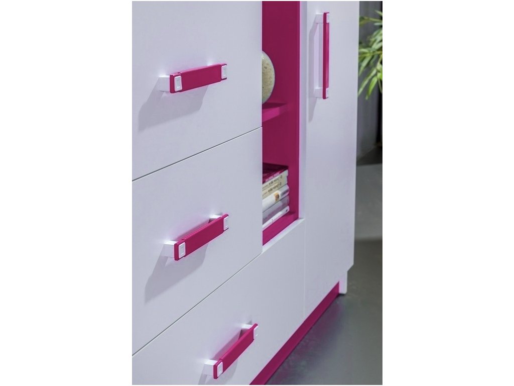 Kombinovaná skříň TRAFICO ze sektorové řady, která se vyznačuje netradičním zpracováním barev a originalitou úchytů. Tento styl nábytku zaujme každou mladší generaci. Skříň je vyrobena z kvalitní LTD desky hraněné ABS lištou. Korpus i dveře jsou v bílé matné barvě, doplňková barva je růžová. Úchytky jsou v barevné kombinaci růžová/bílá. Uvnitř skříně jsou 4 police, v dolní části je zásuvka. Sektorový nábytek TRAFICO má široký výběr prvků, který Vám zaručí sestavit si dětský nebo studentský pokoj, ložnici či kancelář podle svých potřeb, přání a představ. Dodáváme v demontovaném stavu.Doplňkové parametry