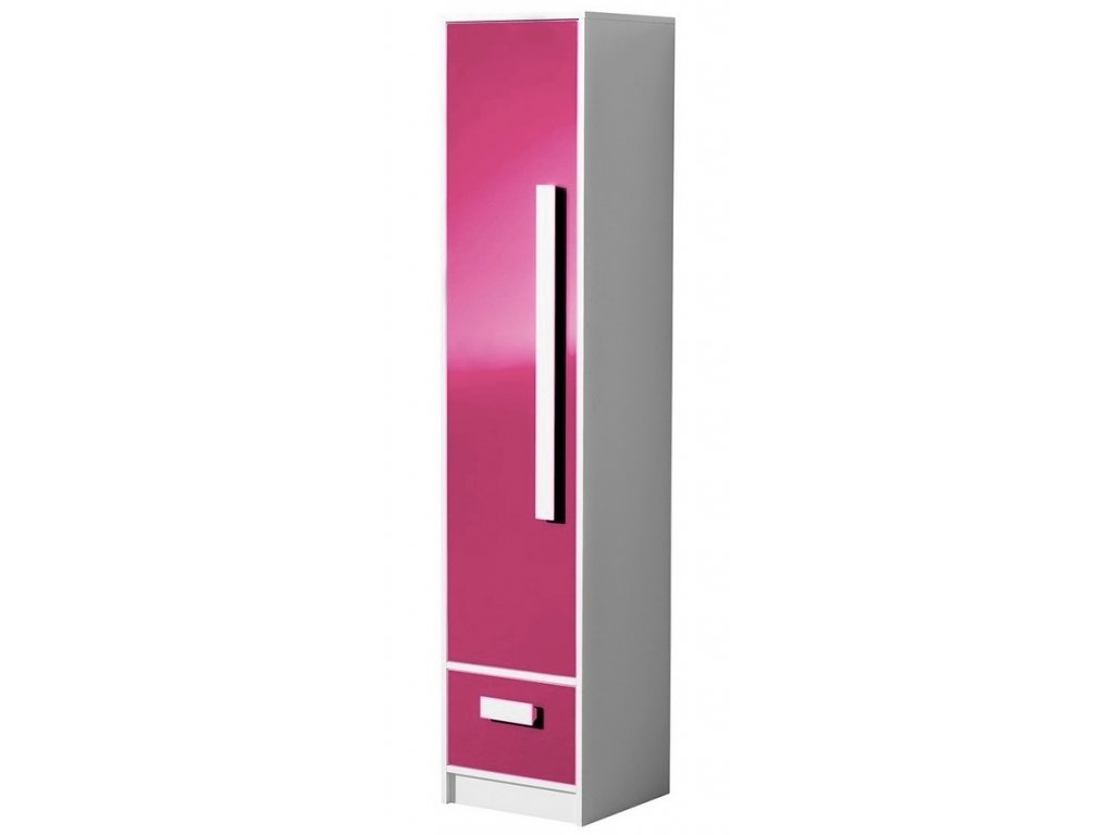 Úzká policová jednodveřová skříň se zásuvkou ze sektorové řady GULLIWER, která se vyznačuje netradičním zpracováním barev a originalitou úchytů. Tento styl nábytku zaujme každou mladší generaci. Skříň je vyrobena z kvalitní LTD desky hraněné ABS lištou. Korpus je v barvě bílá mat, dveře jsou barvě růžová lesk. Úchytky jsou v barvě bílé. Sektorový nábytek má široký výběr prvků, který Vám zaručí sestavit si dětský nebo studentský pokoj, ložnici či kancelář podle svých potřeb, přání a představ. Dodáváme v demontovaném stavu.