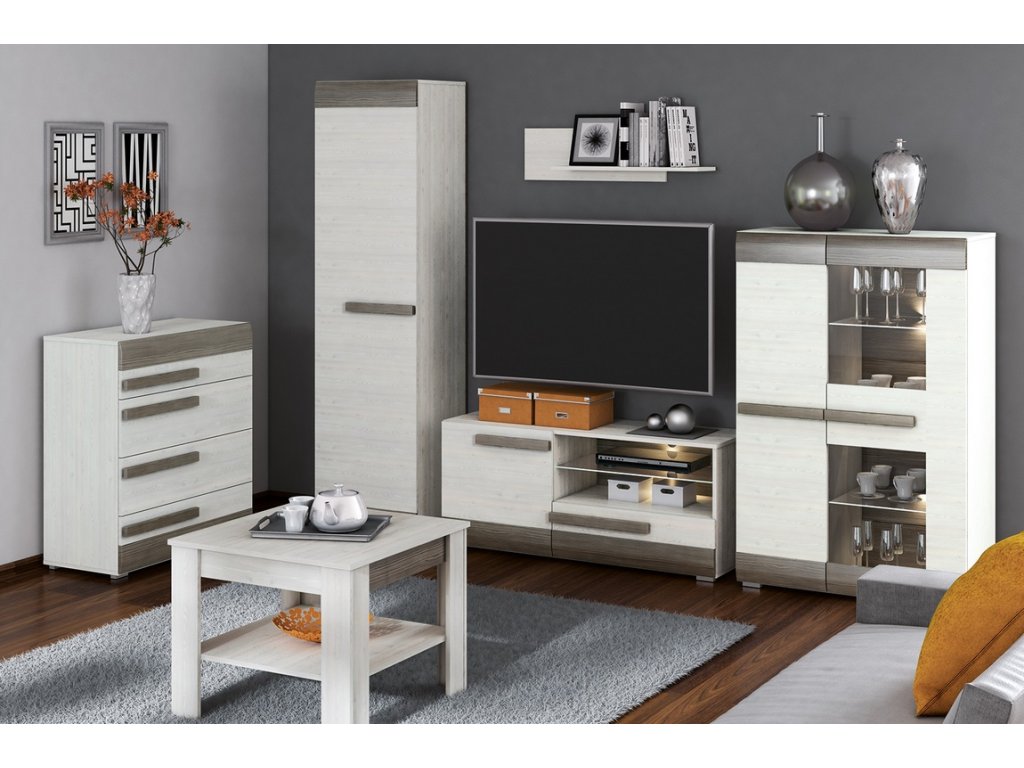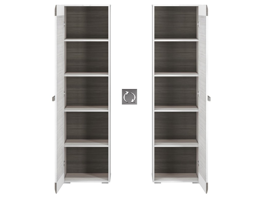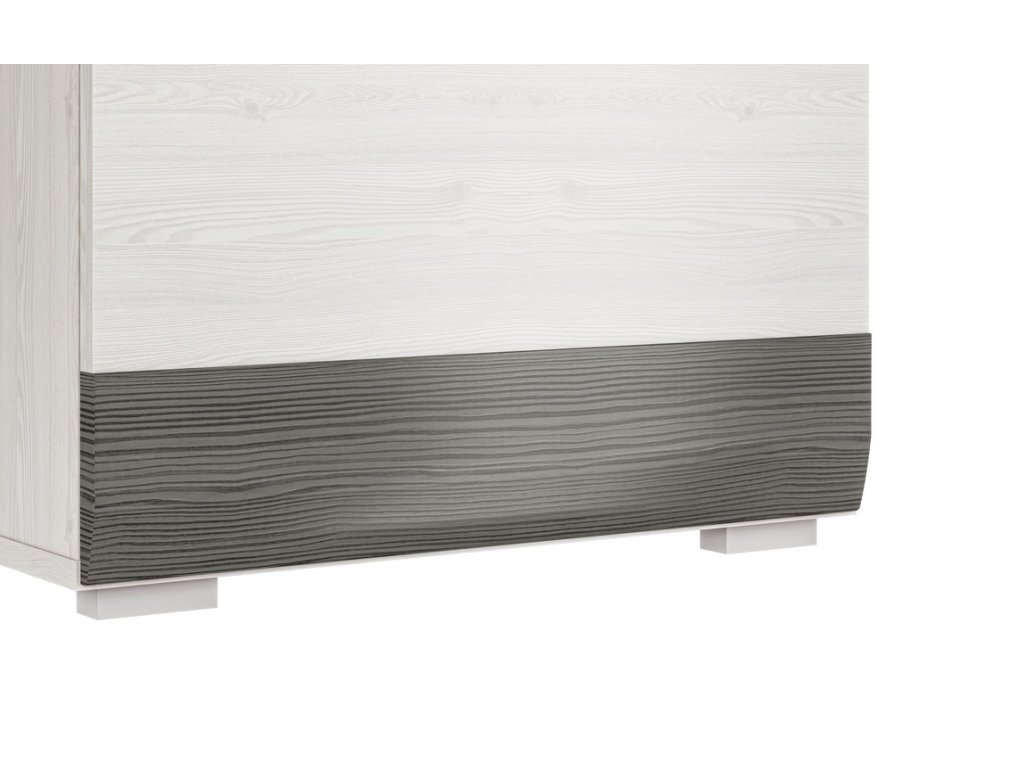 Policová skříň v moderním provedení s rýhovaným dekoračním motivem v šedé barvě. Korpus a dvířka jsou vyrobeny z kvalitní desky LTD hraněné ABS páskou v barvě borovice sněžná, dekorační motivy a úchyty jsou vyrobeny z desky MDF v barvě šedá. Dvířka je možné namontovat na pravou nebo levou stranu. Dodáváme v demontovaném stavu.Doplňkové parametry