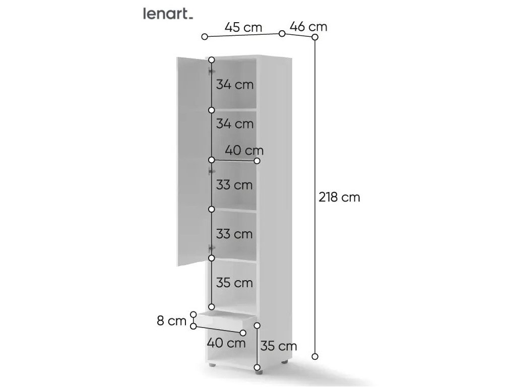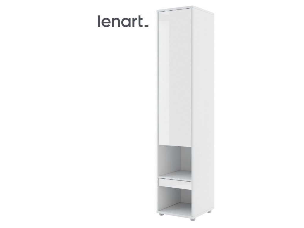 Policová skříň se zásuvkou barva bílá lesk/bílá mat. Rozměry viz obrázek. Nábytek je vyroben z kvalitního lamina s ABS hranou. Lamino je odolné proti poškrábání, poškození, vlhkosti a vysokým teplotám. Dodáváme v demontovaném stavuDoplňkové parametry