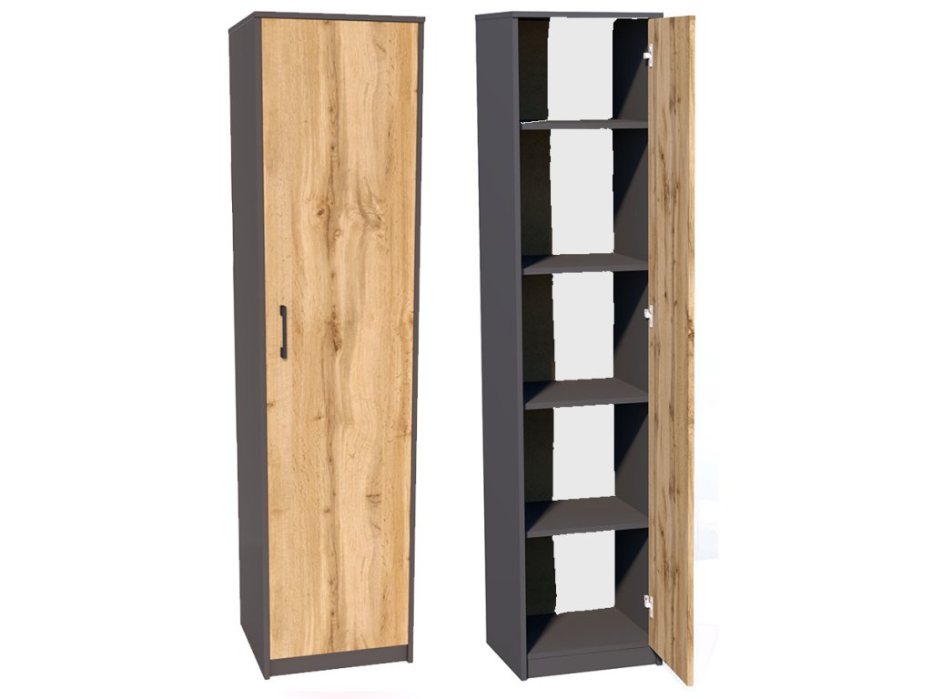 Regál s dvířky je vyroben z kvalitního lamina, korpus je v barevném provedení grafit, dvířka jsou v barvě dub wotan. Dvířka jsou univerzální - montáž je možná na pravou nebo levou stranu. Lamino (16 mm) je odolné proti poškrábání, poškození, vlhkosti a vysokým teplotám. Zadní stěna HDF je bílá. Dodáváme v demontovaném stavu.Doplňkové parametry