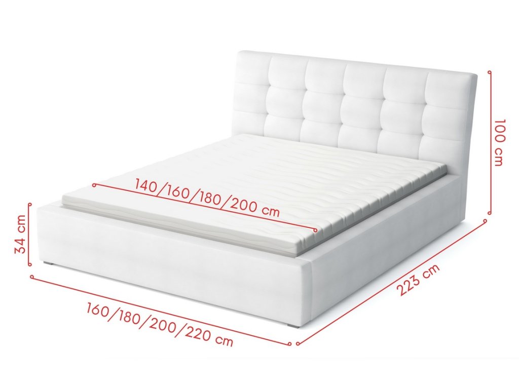 šířka: 140 cm | výška: 100 cm | hloubka: 223 cm Elegantní postel s vysokým prošívaným čalouněným čelem. Nožky jsou plastové v šedé barvě. Rošt je v ceně, ale matrace je potřeba...