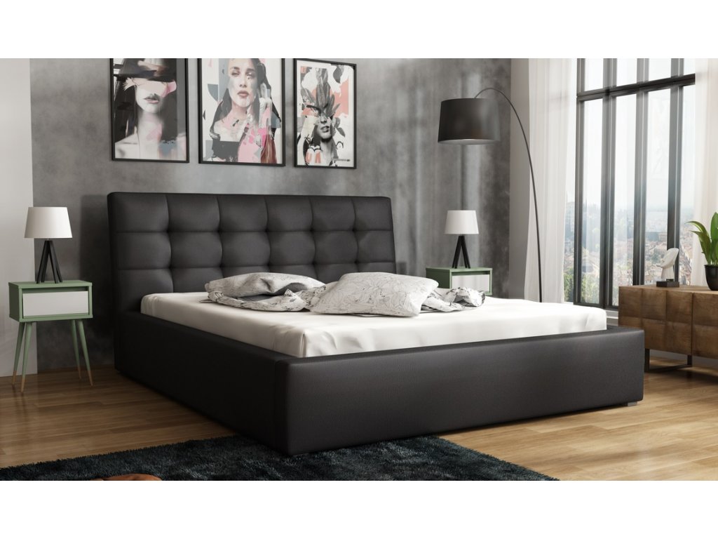 šířka: 200 cm | výška: 100 cm | hloubka: 223 cm Elegantní postel s vysokým čalouněným čelem s ozdobnými knoflíky. Konstrukce je potažena ekokůží v černé barvě. Nožky jsou...