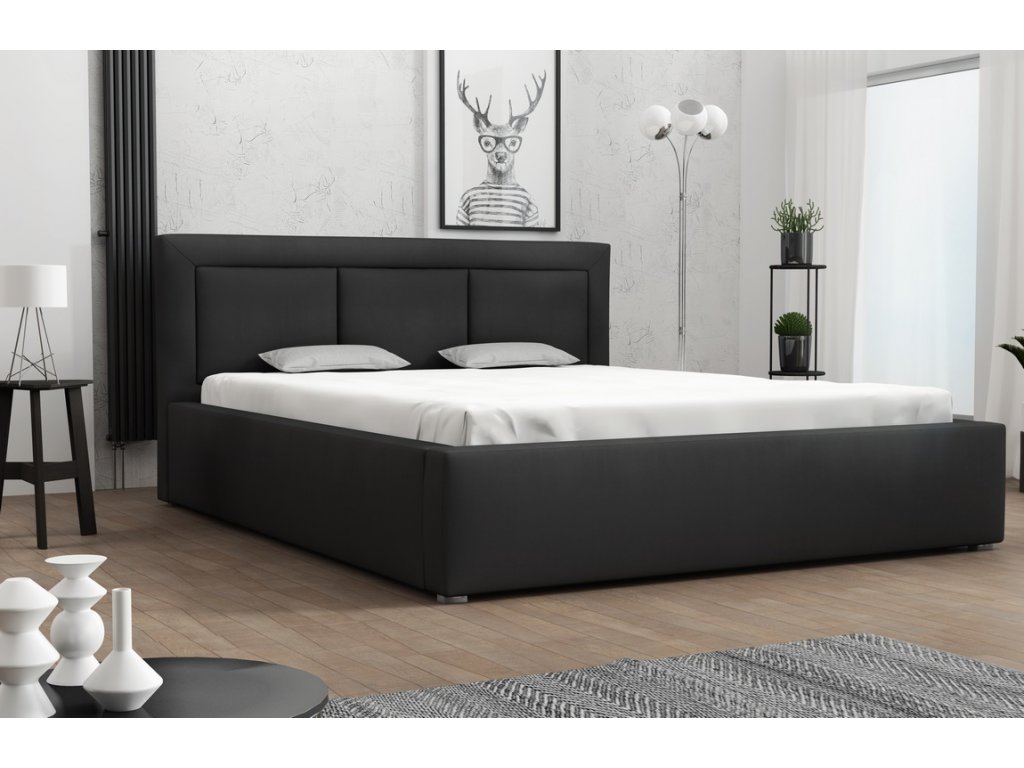 šířka: 200 cm | výška: 93 cm | hloubka: 223 cm Elegantní postel s vysokým prošitým čalouněným čelem. Konstrukce je potažena látkou v černé barvě. Nožky jsou plastové v šedé...