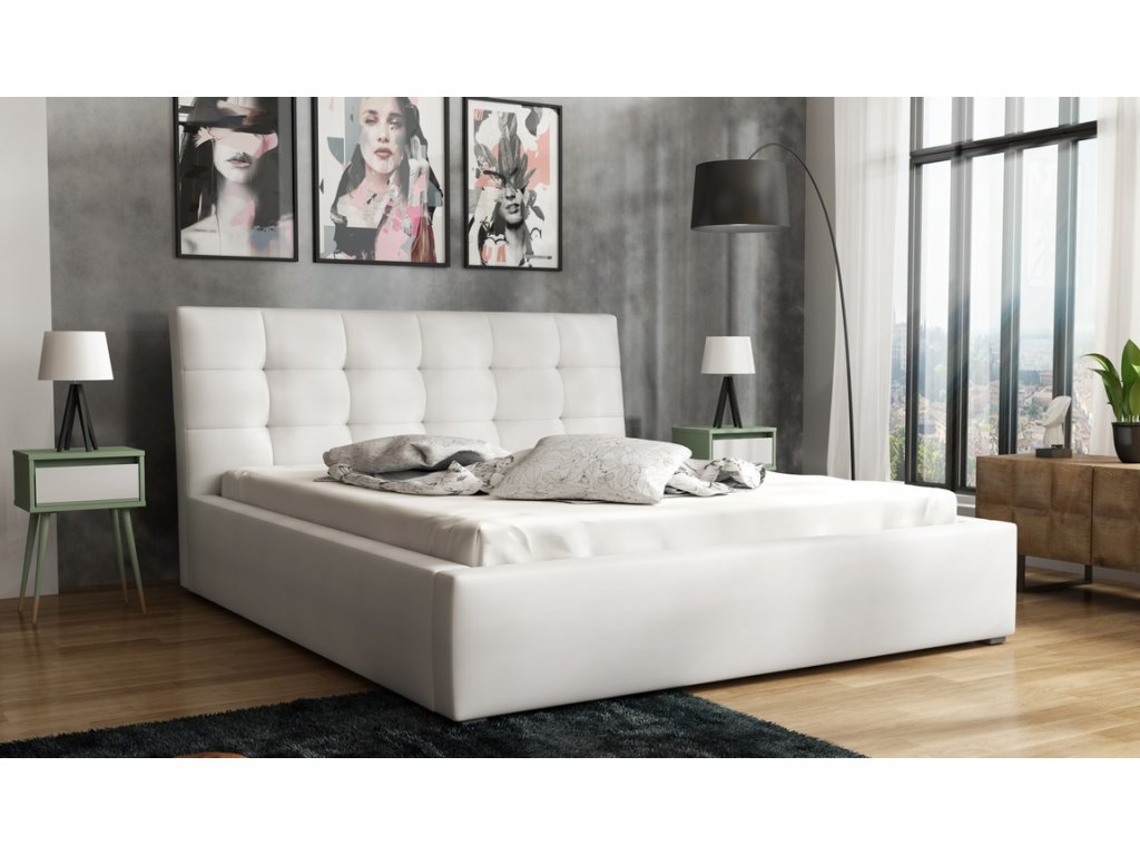 šířka: 200 cm | výška: 100 cm | hloubka: 223 cm Elegantní postel s vysokým čalouněným čelem s ozdobnými knoflíky. Konstrukce je potažena ekokůží v bílé barvě. Nožky jsou...
