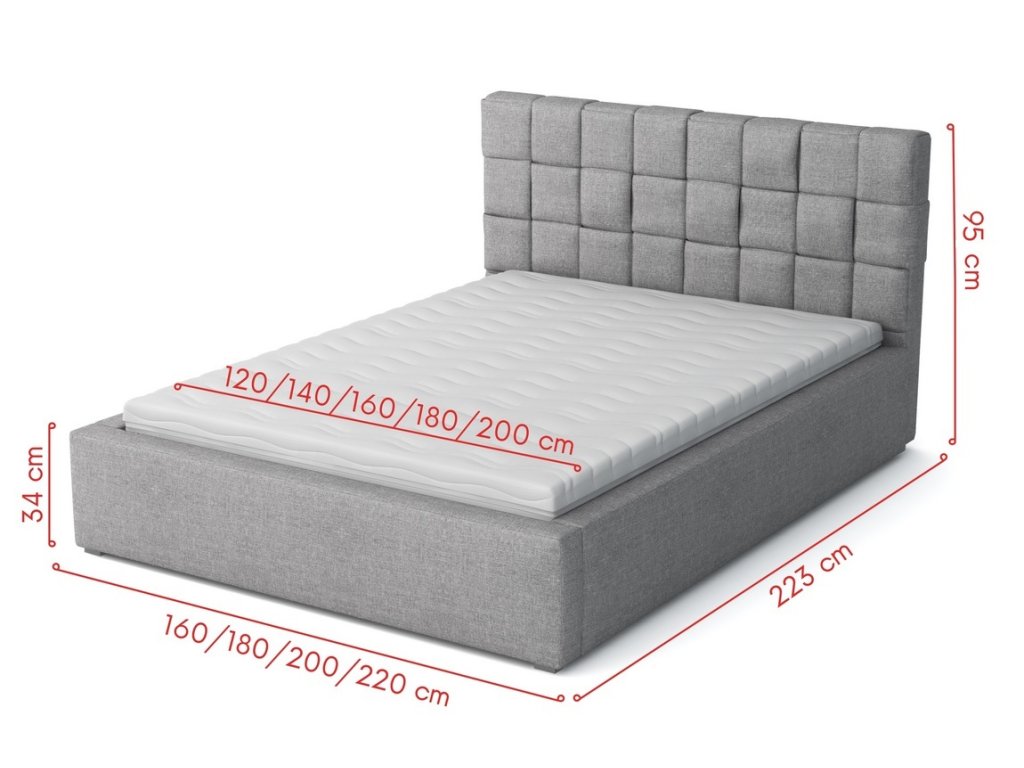 šířka: 220 cm | výška: 95 cm | hloubka: 223 cm Elegantní postel s vysokým prošívaným čalouněným čelem. Nožky jsou plastové v šedé barvě. Rošt je v ceně, ale matrace je potřeba...