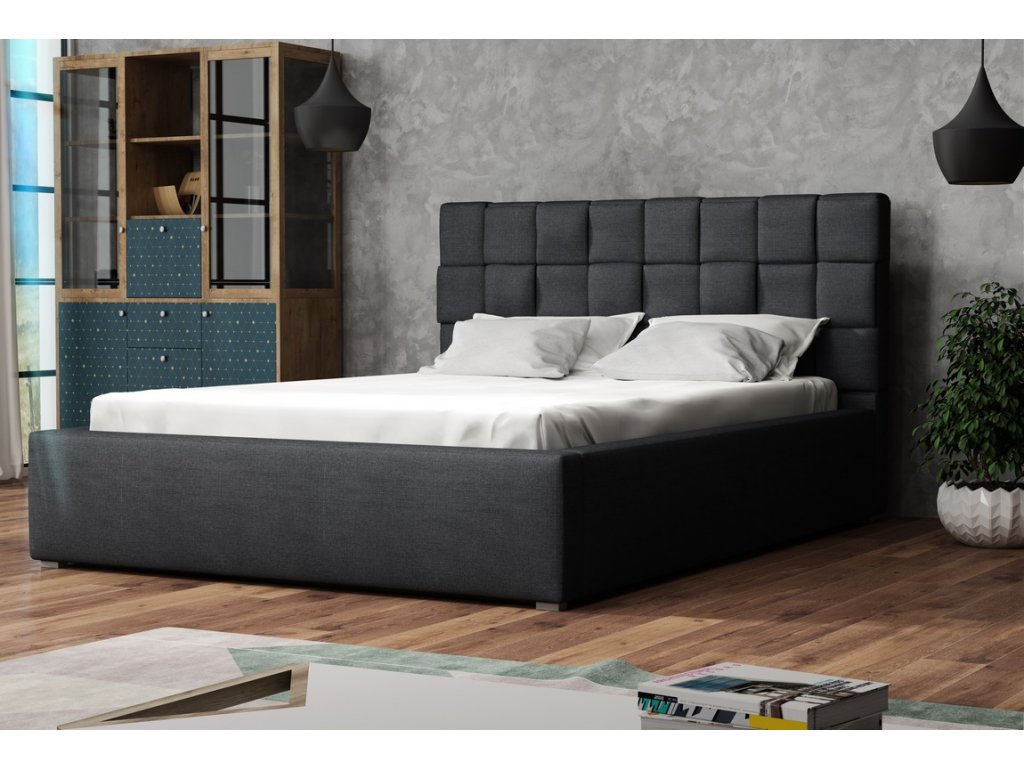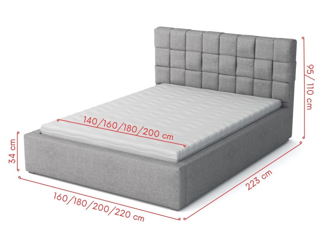 Elegantní postel s vysokým prošívaným čalouněným čelem. Nožky jsou plastové v šedé barvě. Rošt je v ceně, ale matrace je potřeba doobjednat. Vhodný rozměr matrace je 140 x 200 cm. Za příplatek je možné objednat postel s kovovým zvedacím roštem, tím vznikne pod ložnou plochou úložný prostor. Cena za postel s kovovým roštem na vyžádaní. Změnu roštu je nutné zadat při první objednávce. Výška bočnice od země je 34 cm, výška roštu od země je cca 24 cm. Dodáváme v demontovaném stavu.Doplňkové parametry