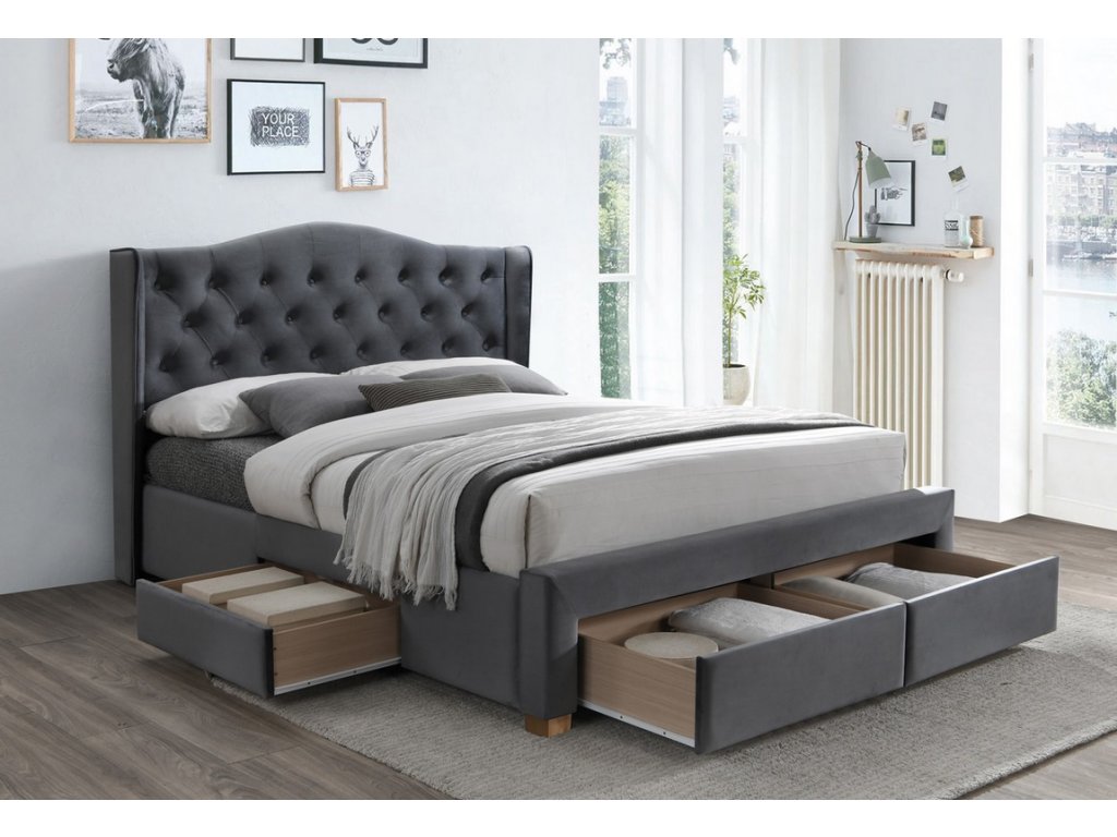 Čalouněná postel originálního vzhledu s krásným prošíváním bude jako královská lóže pro ty, co si potrpí na styl a eleganci. Konstrukce je potažena látkou aksamit v šedé barvě, nožky jsou ze dřeva v barvě dub. Úložné prostory a rošt jsou součástí postele ( klasický lamelový rošt v plastových pouzdrech ). Matraci nutno doobjednat o rozměrech 160 x 200 cm. Výška nožek 5 cm. Dodáváme v demontovaném stavu.Doplňkové parametry
