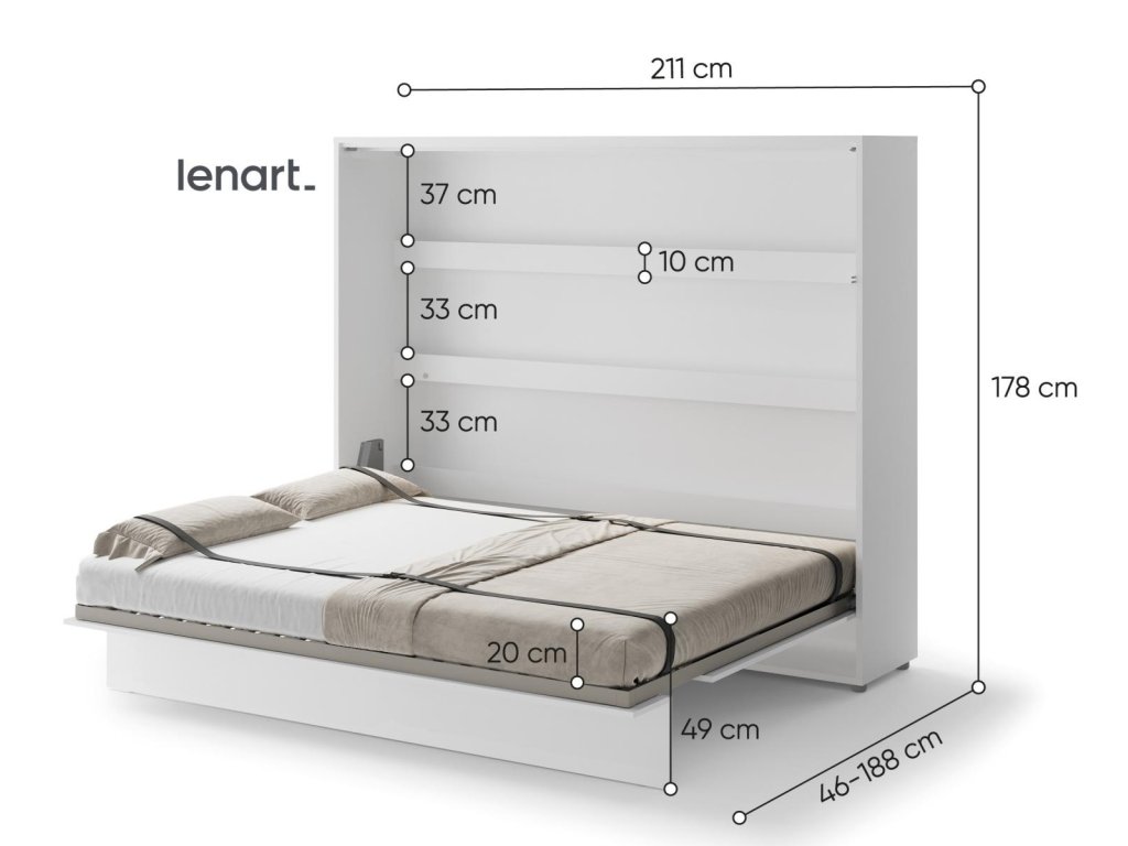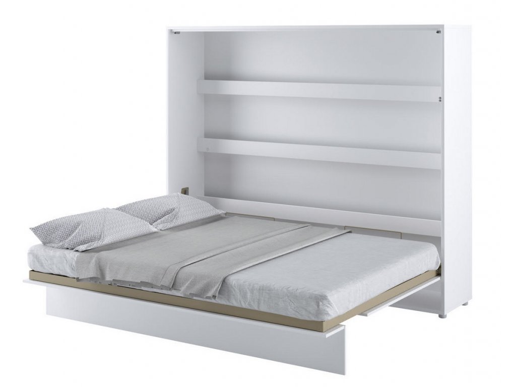 Široká výklopná postel 160 bílá mat. Rozměry viz obrázek. Se sklápěcí postelí Vás už nebude trápit malý prostor Vaší domácnosti. Díky stabilní konstrukci zaručuje pohodlný odpočinek. Pneumatický mechanismus sklápění postele zajistí bezpečné otevírání a je doplněn SOFT CLOSE systémem tichého zavírání. Tento výjimečný systém Vám umožní manipulaci pouze jedním prstem. Když je postel sklopená, vypadá jako běžná skříň. Vyklopením se vytáhne celá šířka postele. Při lozložení postele má hloubku 188 cm. Uvnitř skříně jsou praktické police na knížky nebo dekorační předměty, vše máte na dosah ruky. Maximální zatížení polic je 5 kg. Rám je nutno přišroubovat ke zdi, nosnost postele je 200 kg. Rošt postele je v ceně, matrace není součástí, je potřeba ji dokoupit. Doporučujeme velikost 160 x 200 x výšku do 18 cm. Po sklopení postele vzniká prostor pod postelí o výšce 24,9 cm. Nábytek je vyroben z kvalitního lamina s ABS hranou. Lamino je odolné proti poškrábání, poškození, vlhkosti a vysokým teplotám. Postel nabízíme v několika velikostech a barevných provedeních. K posteli je možné dokoupit LED osvětlení. Dodáváme v demontovaném stavu. Můžete si prohlédnout prezentační video, klikněte ZDE.Doplňkové parametry