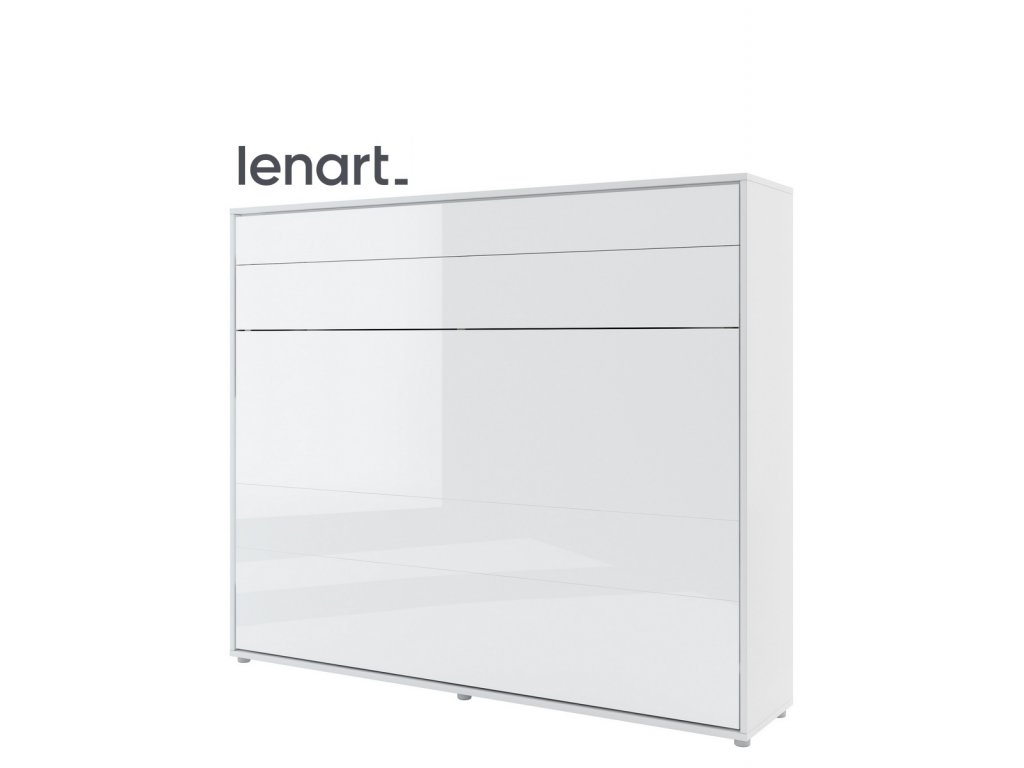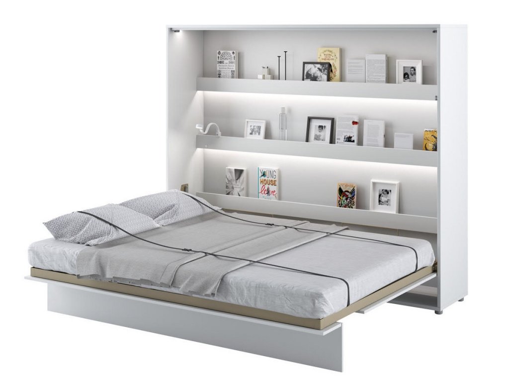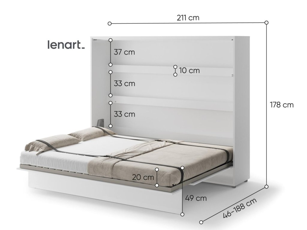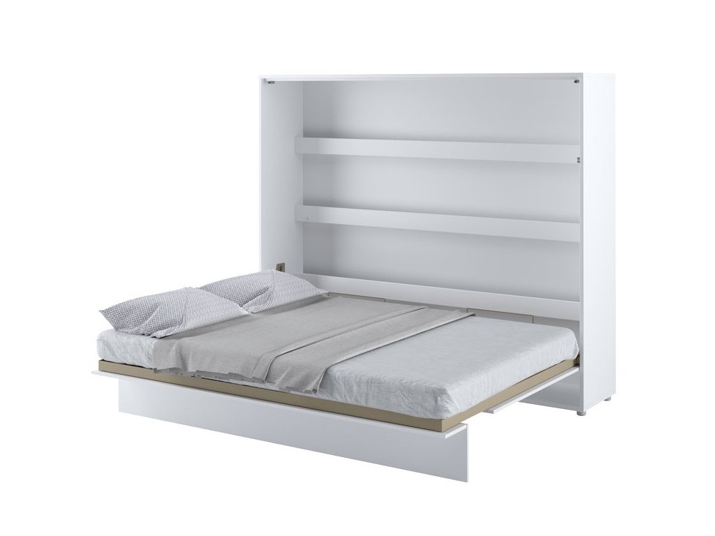 Široká výklopná postel 160 bílá lesk/bílá mat. Rozměry viz obrázek. Se sklápěcí postelí Vás už nebude trápit malý prostor Vaší domácnosti. Díky stabilní konstrukci zaručuje pohodlný odpočinek. Pneumatický mechanismus sklápění postele zajistí bezpečné otevírání a je doplněn SOFT CLOSE systémem tichého zavírání. Tento výjimečný systém Vám umožní manipulaci pouze jedním prstem. Když je postel sklopená, vypadá jako běžná skříň. Vyklopením se vytáhne celá šířka postele. Při lozložení postele má hloubku 188 cm. Uvnitř skříně jsou praktické police na knížky nebo dekorační předměty, vše máte na dosah ruky. Maximální zatížení polic je 5 kg. Rám je nutno přišroubovat ke zdi, nosnost postele je 200 kg. Rošt postele je v ceně, matrace není součástí, je potřeba ji dokoupit. Doporučujeme velikost 160 x 200 x výšku do 18 cm. Po sklopení postele vzniká prostor pod postelí o výšce 24,9 cm. Nábytek je vyroben z kvalitního lamina s ABS hranou. Lamino je odolné proti poškrábání, poškození, vlhkosti a vysokým teplotám. Postel nabízíme v několika velikostech a barevných provedeních. K posteli je možné dokoupit LED osvětlení. Dodáváme v demontovaném stavu. Můžete si prohlédnout prezentační video, klikněte ZDE.Doplňkové parametry