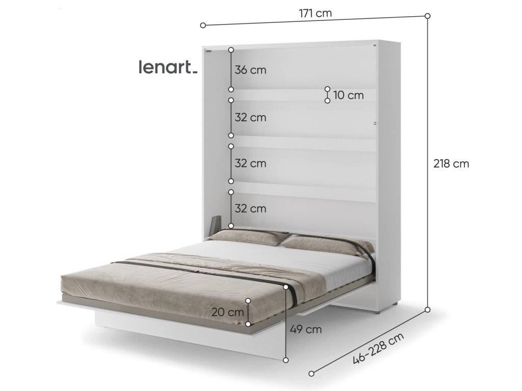 Vysoká výklopná postel 160 bílá mat. Rozměry viz obrázek. Se sklápěcí postelí Vás už nebude trápit malý prostor Vaší domácnosti. Díky stabilní konstrukci zaručuje pohodlný odpočinek. Pneumatický mechanismus sklápění postele zajistí bezpečné otevírání a je doplněn SOFT CLOSE systémem tichého zavírání. Tento výjimečný systém Vám umožní manipulaci pouze jedním prstem. Když je postel sklopená, vypadá jako běžná skříň. Vyklopením se vytáhne celá délka postele. Při lozložení postele má hloubku 228 cm. Uvnitř skříně jsou praktické police na knížky nebo dekorační předměty, vše máte na dosah ruky. Rám je nutno přišroubovat ke zdi, nosnost postele je 200 kg. Rošt postele je v ceně, matrace není součástí, je potřeba ji dokoupit. Doporučujeme velikost 160 x 200 x výšku do 18 cm. Po sklopení postele vzniká prostor pod postelí o výšce 20,4 cm. Nábytek je vyroben z kvalitního lamina s ABS hranou. Lamino je odolné proti poškrábání, poškození, vlhkosti a vysokým teplotám. Postel nabízíme v několika velikostech a barevných provedeních. K posteli je možné dokoupit LED osvětlení. Dodáváme v demontovaném stavu. Můžete si prohlédnout prezentační video, klikněte ZDE.Doplňkové parametry