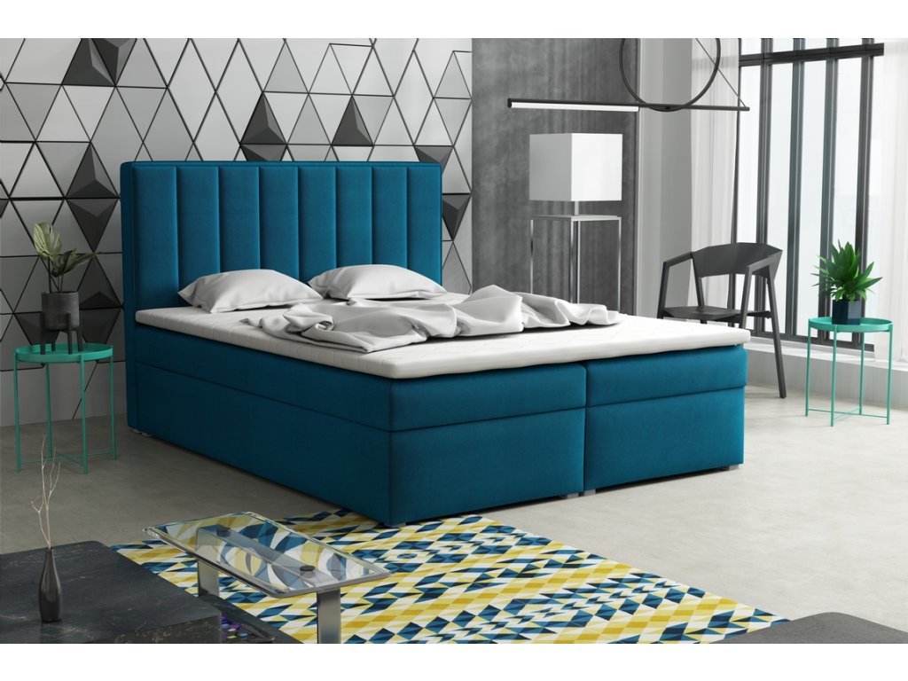 Elegantní kontinentální postel moderního vzhledu s vysokým čelem s dekoračním prošíváním. Postel se dodává zároveň s matrací - boxspring styl. Pevná konstrukce postele je potažena látkou v barvě Bluvel 85. Na ní se nachází vysoká bonelová matrace potažena stejnou látkou. Na ní je druhá tenká matrace v celku vyrobena z kvalitní hrubé PUR pěny tzv. topper (výška cca 5 cm). Ložní plocha činí 180 x 200 cm. Výška ložné plochy od země je cca 53 cm. Rozměry úložného prostoru - 2x (197x67x30 cm). Úložný prostor je k dispozici nadzvednutím matrace z boční strany postele.Doplňkové parametry