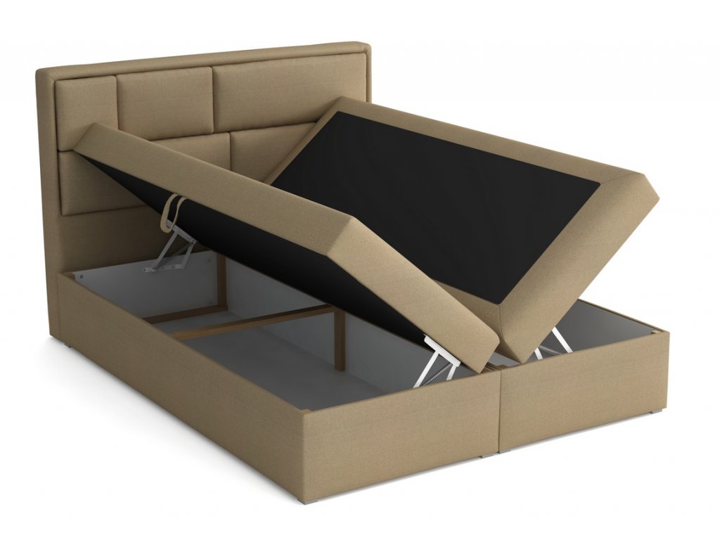 Elegantní kontinentální postel moderního vzhledu s vysokým čelem s dekoračním prošíváním. Postel se dodává zároveň s matrací - boxspring styl. Pevná konstrukce postele je potažena látkou v barvě světle šedé. Na ní se nachází vysoká bonelová matrace potažena stejnou látkou. Na ní je druhá tenká matrace v celku vyrobena z kvalitní hrubé PUR pěny tzv. topper (výška cca 5 cm). Ložní plocha činí 180 x 200 cm. Výška ložné plochy od země je cca 53 cm. Rozměry úložného prostoru - 2x (197x87x30 cm). Úložný prostor je k dispozici nadzvednutím matrace z boční strany postele.Doplňkové parametry