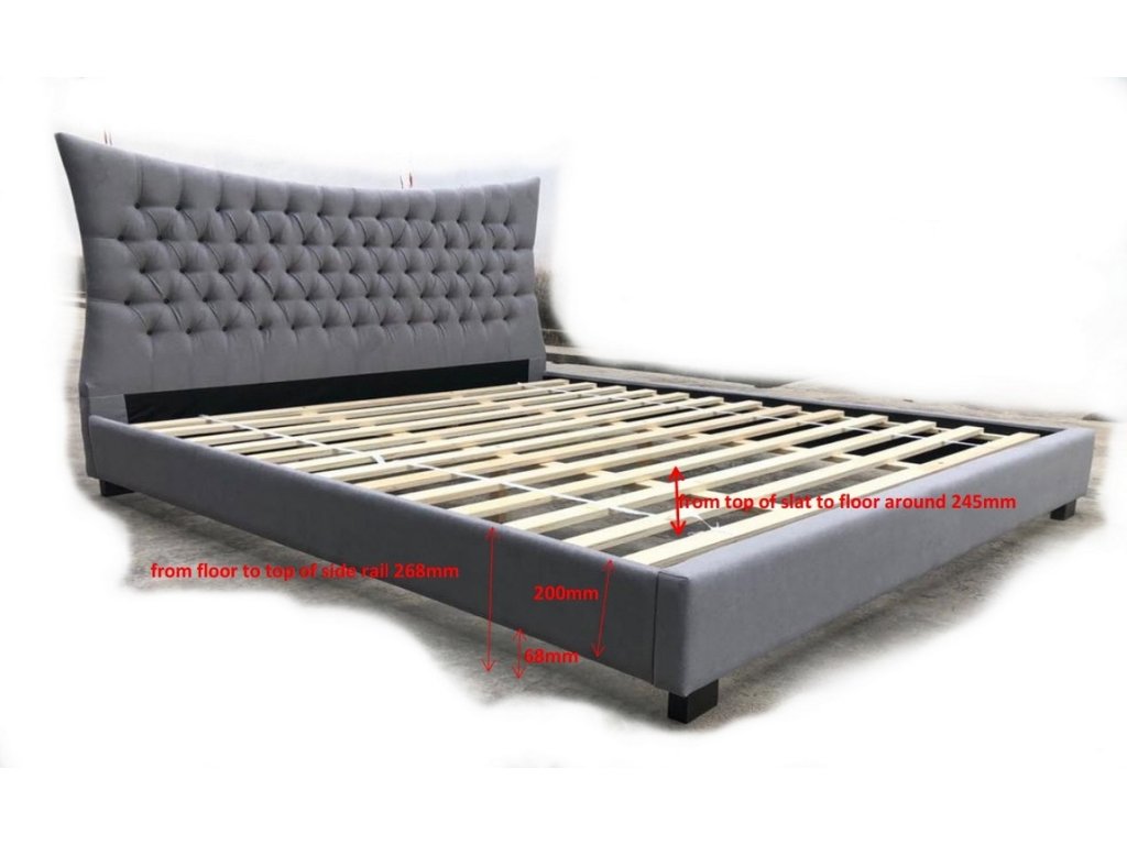 Elegantní postel originálního vzhledu s výrazným prošívaným vysokým čelem. Konstrukce je potažena krásnou látkou šedé barvy. Nožky postele jsou v barvě tmavý ořech a mají výšku 6,5 cm. Rošt je v ceně, ale matrace je třeba doobjednat. Vhodný rozměr 180 x 200 cm. Výška roštu od země je 22 cm. Dodáváme v demontovaném stavu.Doplňkové parametry