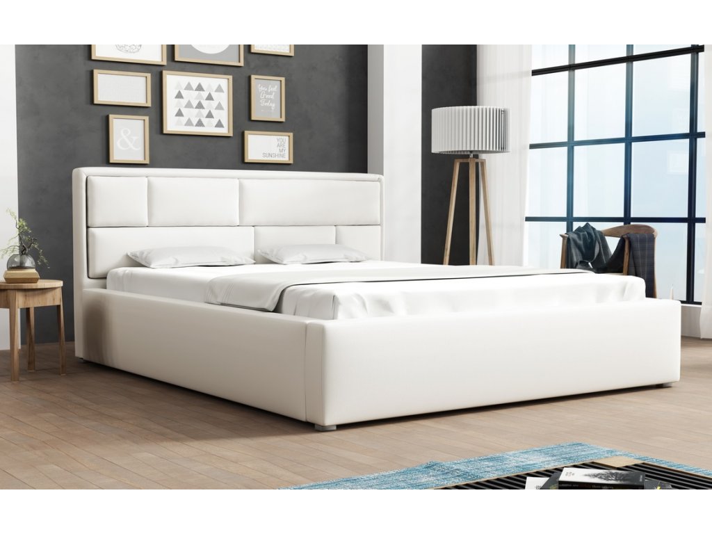 Elegantní postel s vysokým prošitým čalouněným čelem. Konstrukce je potažena ekokůží v bílé barvě. Nožky jsou plastové v šedé barvě. Rošt je v ceně, ale matrace je potřeba doobjednat, vhodný rozměr 180 x 200 cm nebo 2 x matrace 90 x 200 cm. Za příplatek je možné objednat postel s kovovým zvedacím roštem, tím vznikne pod ložnou plochou úložný prostor. Cena za postel s kovovým roštem na vyžádaní. Změnu roštu je nutné zadat při první objednávce. Výška bočnice od země je 34 cm, výška roštu od země je cca 24 cm. Dodáváme v demontovaném stavu.Doplňkové parametry