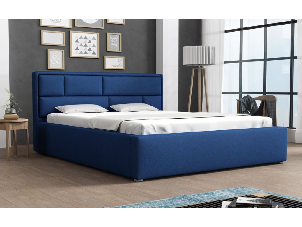 Elegantní postel s vysokým prošitým čalouněným čelem. Konstrukce je potažena látkou v granátově modré barvě. Nožky jsou plastové v šedé barvě. Rošt je v ceně, ale matrace je potřeba doobjednat, vhodný rozměr 180 x 200 cm nebo 2 x matrace 90 x 200 cm. Za příplatek je možné objednat postel s kovovým zvedacím roštem, tím vznikne pod ložnou plochou úložný prostor. Cena za postel s kovovým roštem na vyžádaní. Změnu roštu je nutné zadat při první objednávce. Výška bočnice od země je 34 cm, výška roštu od země je cca 24 cm. Dodáváme v demontovaném stavu.Doplňkové parametry