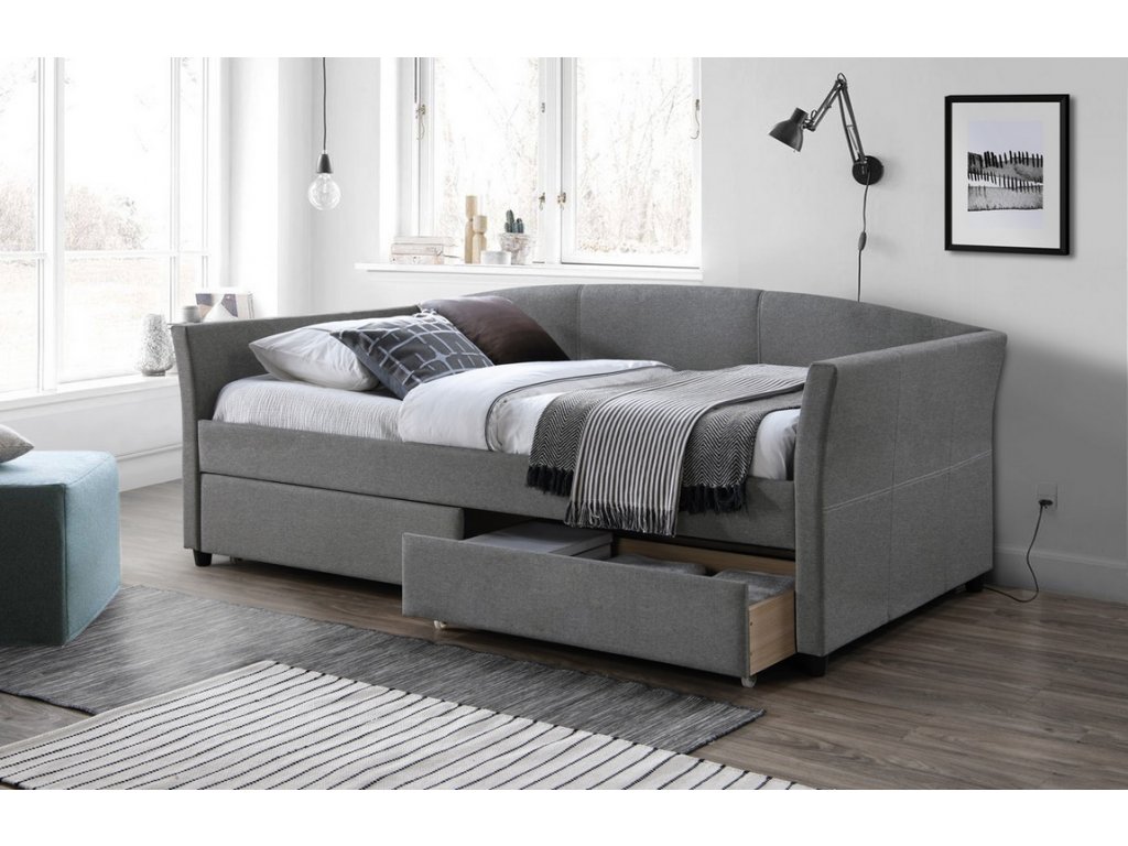 Čalouněná postel s úložným prostorem. Může plnit funkci pohovky, vhodná také do obývacího pokoje či malých obytných prostor, kde využijete možnost posezení přes den a pohodlné spaní na noc. Konstrukce je potažena látkou v šedé barvě. Rošt je součástí postele. Matraci nutno doobjednat o rozměrech 90 x 200 cm. Dodáváme v demontovaném stavu.Doplňkové parametry